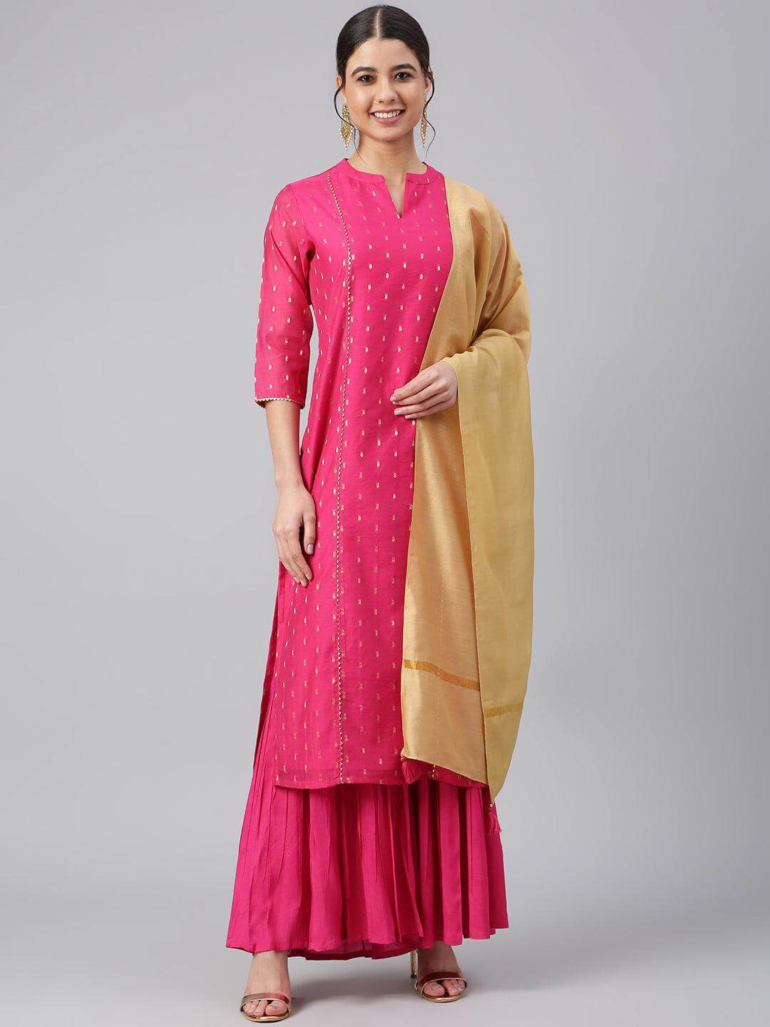 - Janasya is here to serve you this pink chanderi silk kurta set. It features straight kurta, Round-neck, 3/4 sleeves and has lace detailing on the sleeves. It comes along with sharara and beautiful contrasting dupatta which enhance the whole look. Team it up with minimal accessories to complete the look.