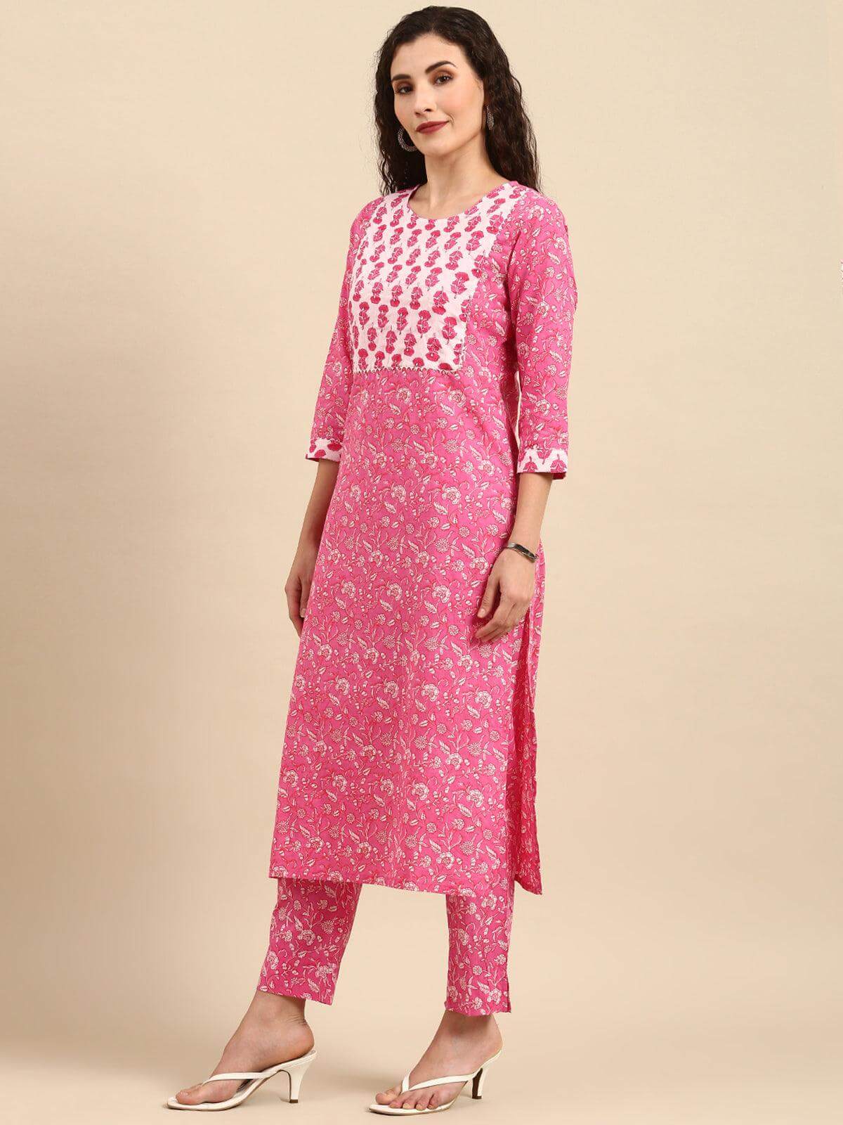 - Create a fashion statement with this beautiful pink floral printed cotton suit set by Janasya. It features a contrast yoke with sequins and gotta patti details, has a round neckline & a straight fit. It comes along with a Pant which has partially elasticated waist and a printed dupatta. The colour combinations will definitely bring out the best in you.