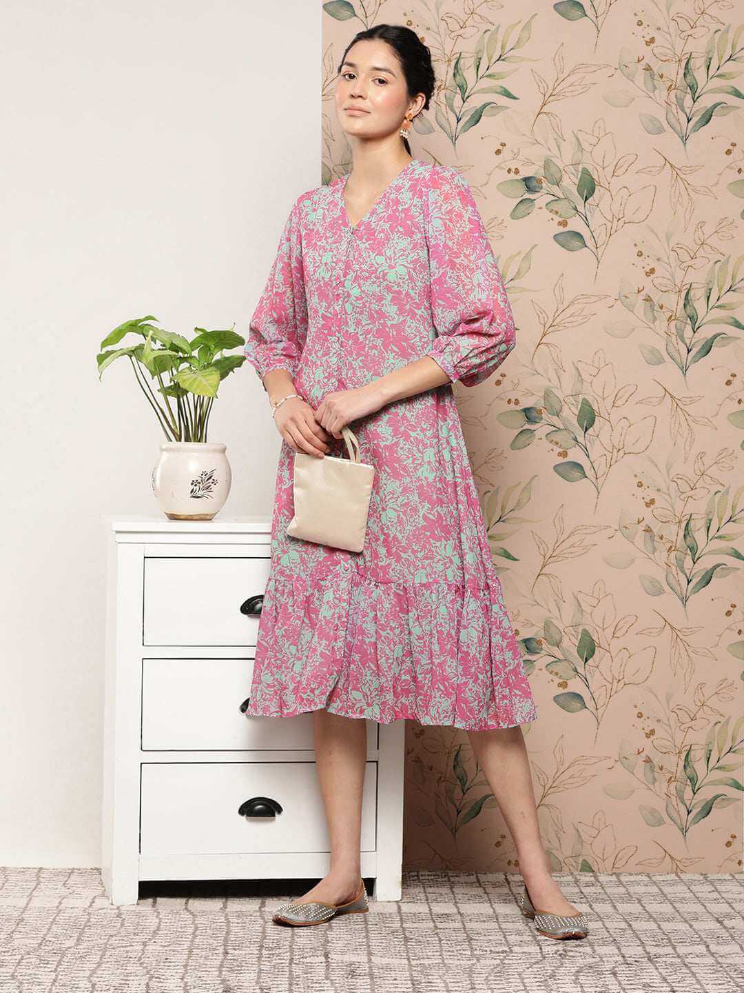 - Style your weekend look into beautiful minimalism trends with this pink floral printed A-line georgette dress. It has all-over floral prints, V- neck, puffed sleeves and gathers at the bottom.