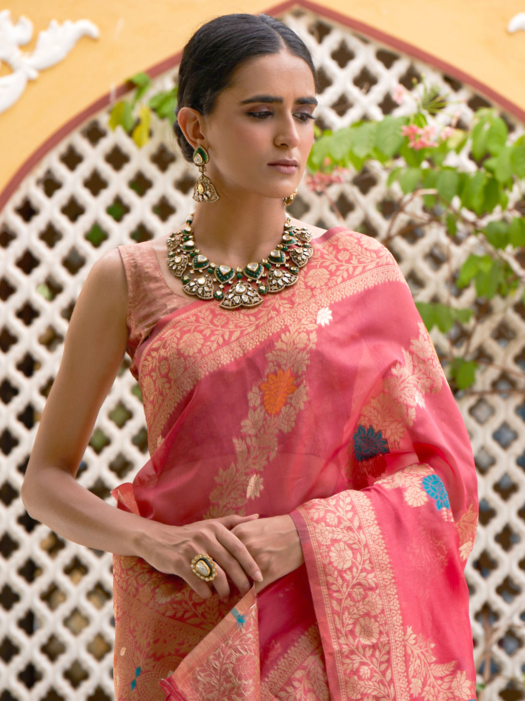 Pink Organza Woven Leheriya Saree with Unstitched Blouse Piece