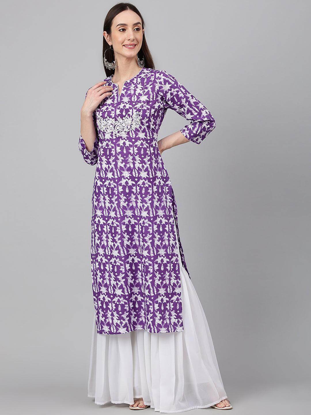 - Give your everyday fashion a twist with this purple cotton batik print kurta. It features notch neck, 3/4sleeves, batik print with straight fit and elegant embroidery detailing on the yoke.