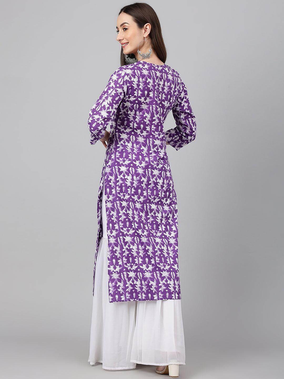- Style:- Length: 46(inch) | Pattern: Batik Print | Occasion: Casual | Type: Straight | Sleeve Type: 3/4 Sleeves Regular Sleeves | Color: Purple