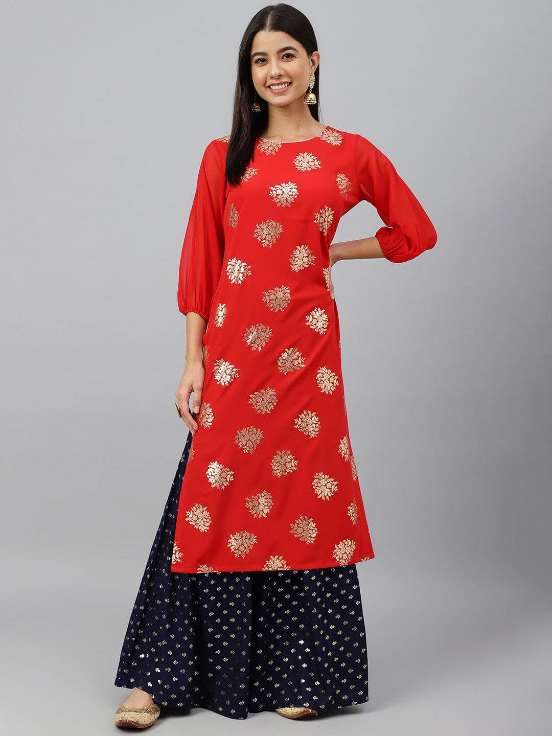 - Give your everyday fashion a twist with this red crepe floral foil print kurta featuring round neck, 3/4 puff sleeves crafted in georgette fabric, all over prints on front panel with golden piping.