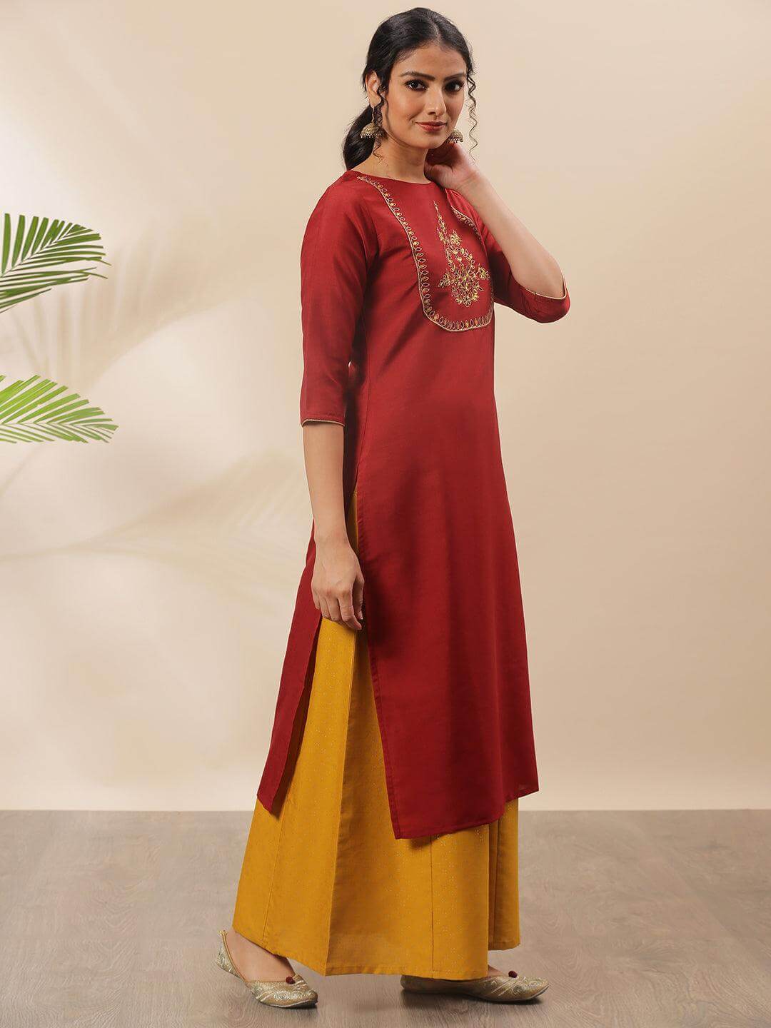 - Ooze refreshing confindence with this beautiful red kurta from Janasya. Masterfully tailored in premium poly silk for superb softness and wear comfort, it has embroidery on yoke with three quarter sleeves and is designed with a regular fit for some classic style. Pair it with white churidars for a great look.