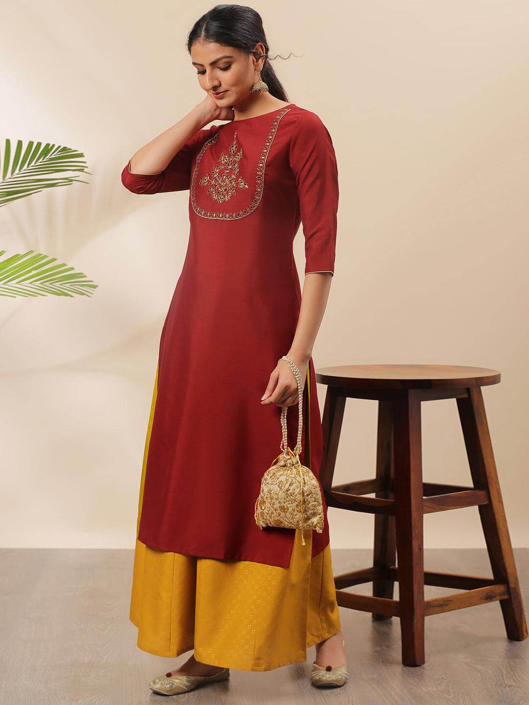 - Style:- Length: 46(inch) | Pattern: Embroidered | Occasion: Festive & Party | Type: Straight | Sleeve Type: 3/4 Sleeves Regular Sleeves | Color: Red