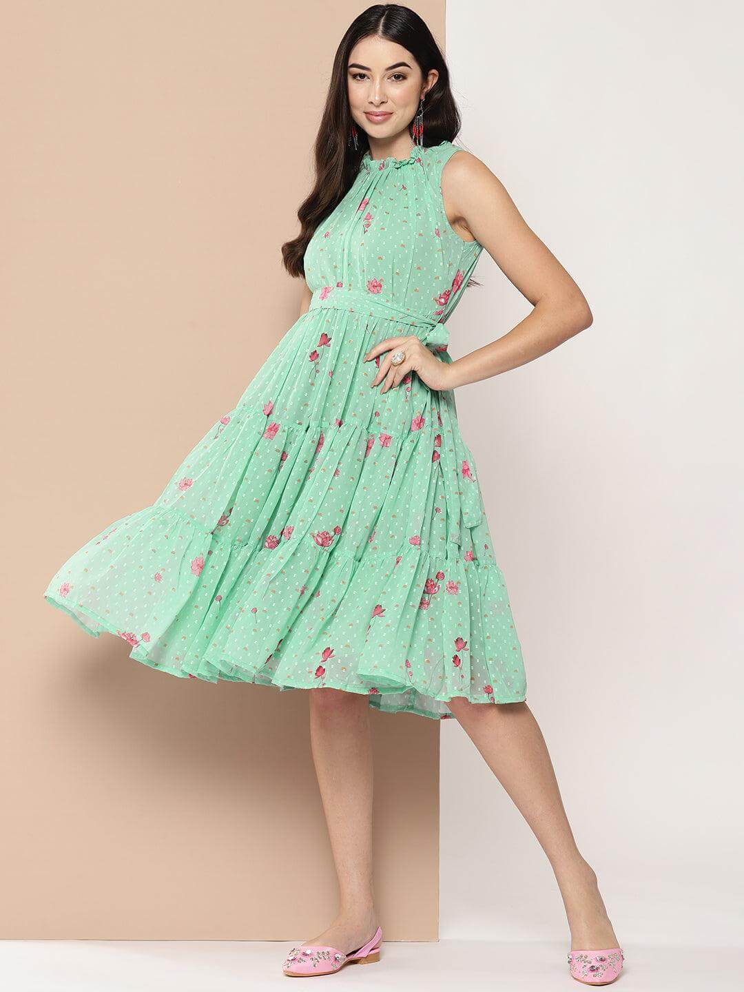 Sea Green Dobby Georgette Floral Printed Tiered Western Dress