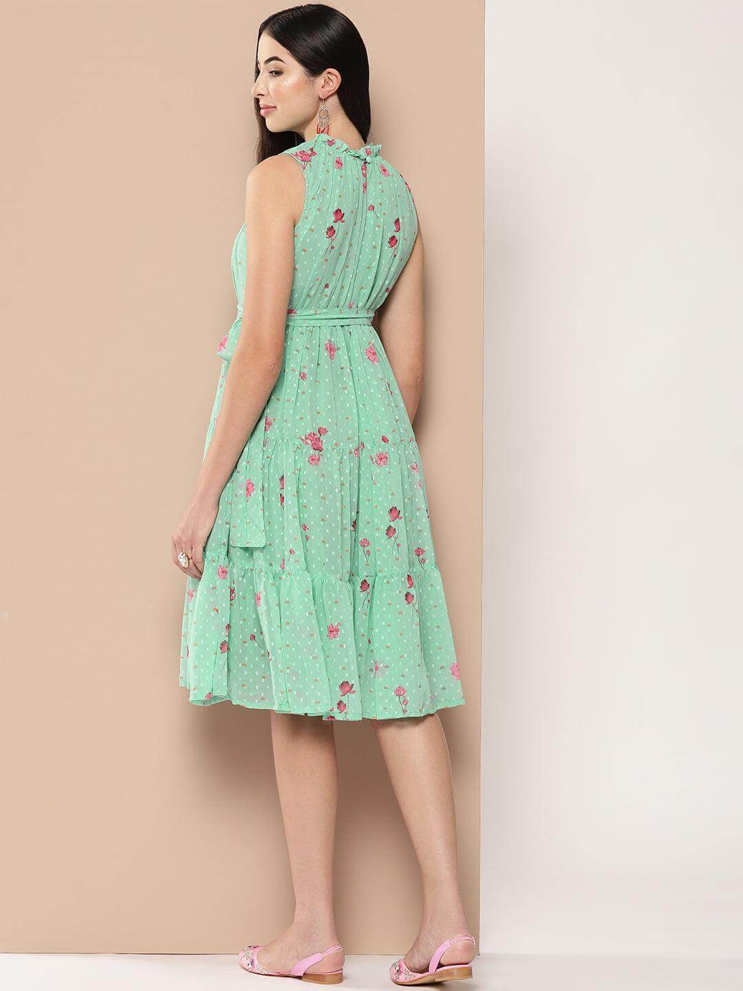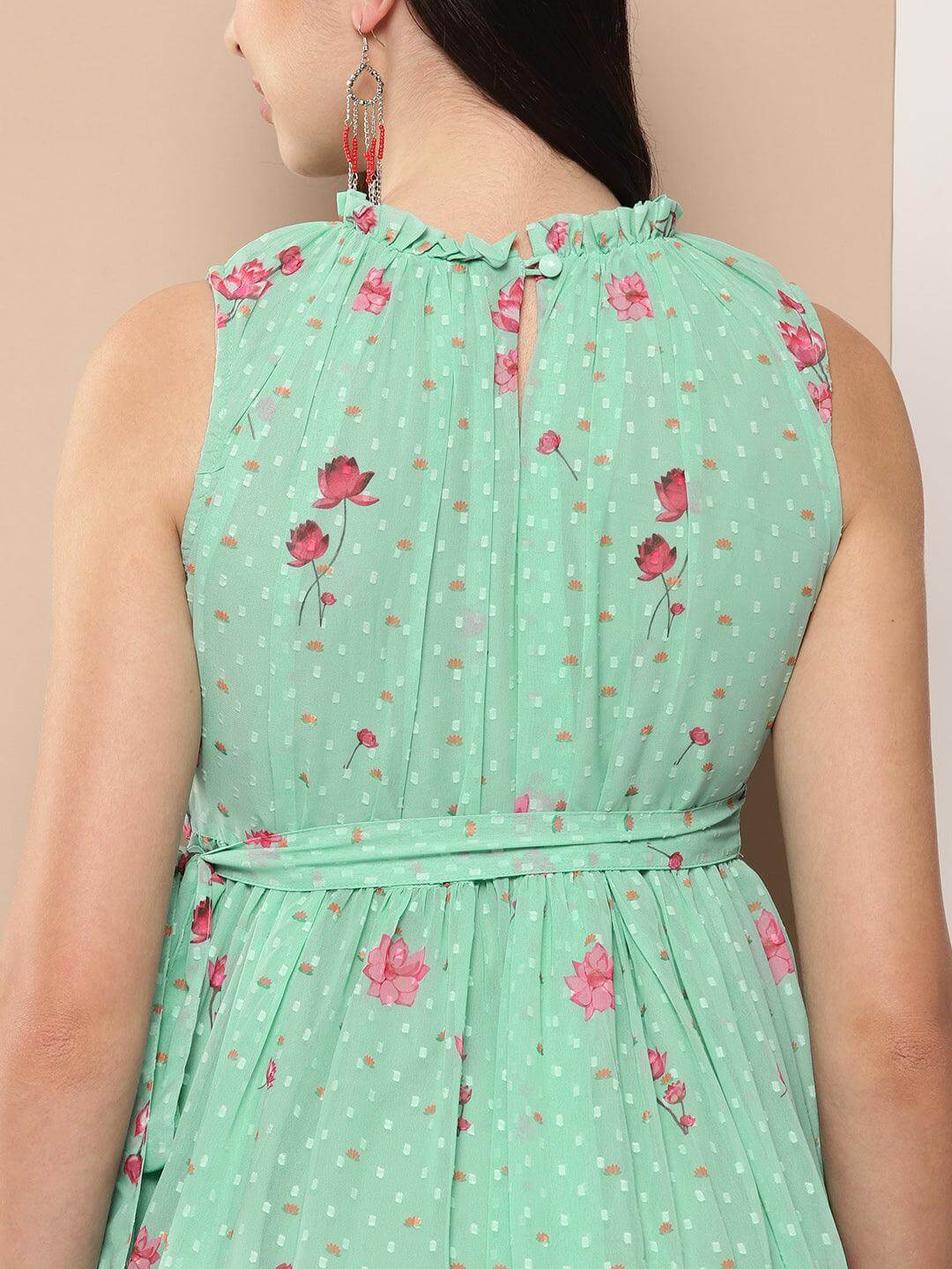 - Style this sea green dobby georgette tiered dress featuring ruffled round neck, sleeveless, pink lotus prints, belt at the waist with fit and flare silhouette. The dress has crepe lining and has a button loop closure.