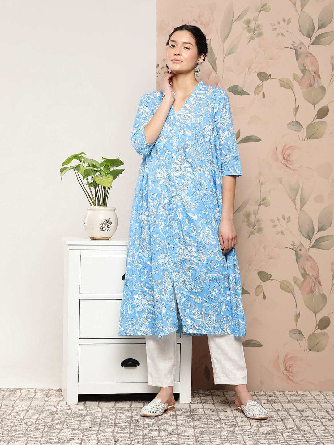 - The sky blue kurti is designed in floral prints. Crafted with 100% cotton. It features V-Neckline, Gathers at the waistline, 3/4 sleeves and has a flared silhoutte. Style with pants or palazzo. Make a statement when you step in for a day out with friends.
