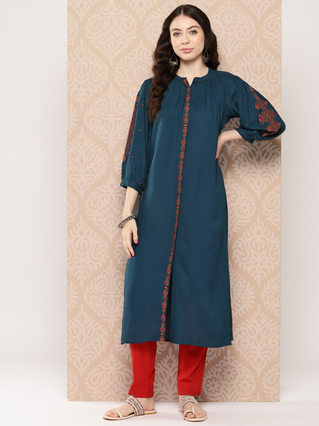 - Style:- Length: 46(inch) | Pattern: Solid | Occasion: Party | Type: Straight | Sleeve Type: 3/4th Sleeves Puff Sleeve | Color: Teal Blue