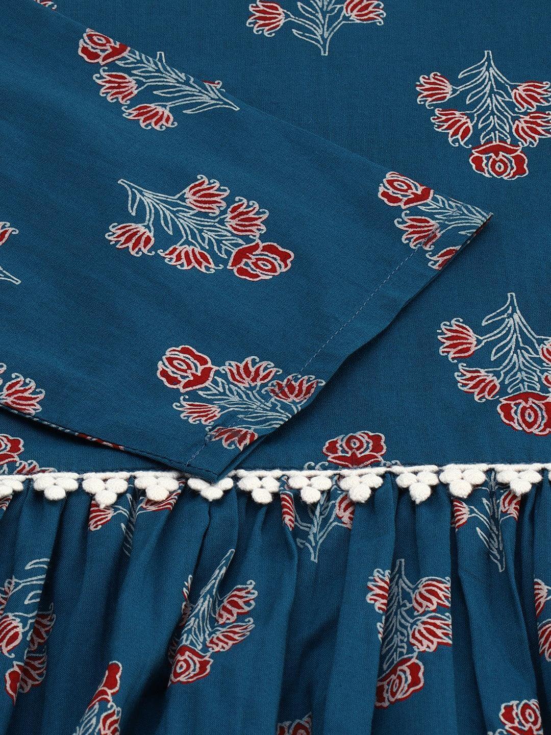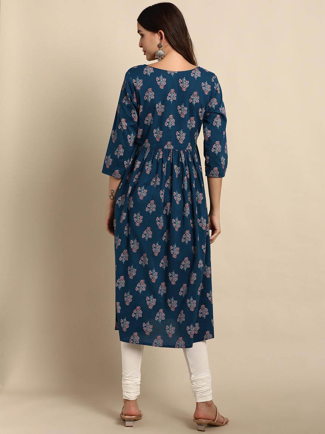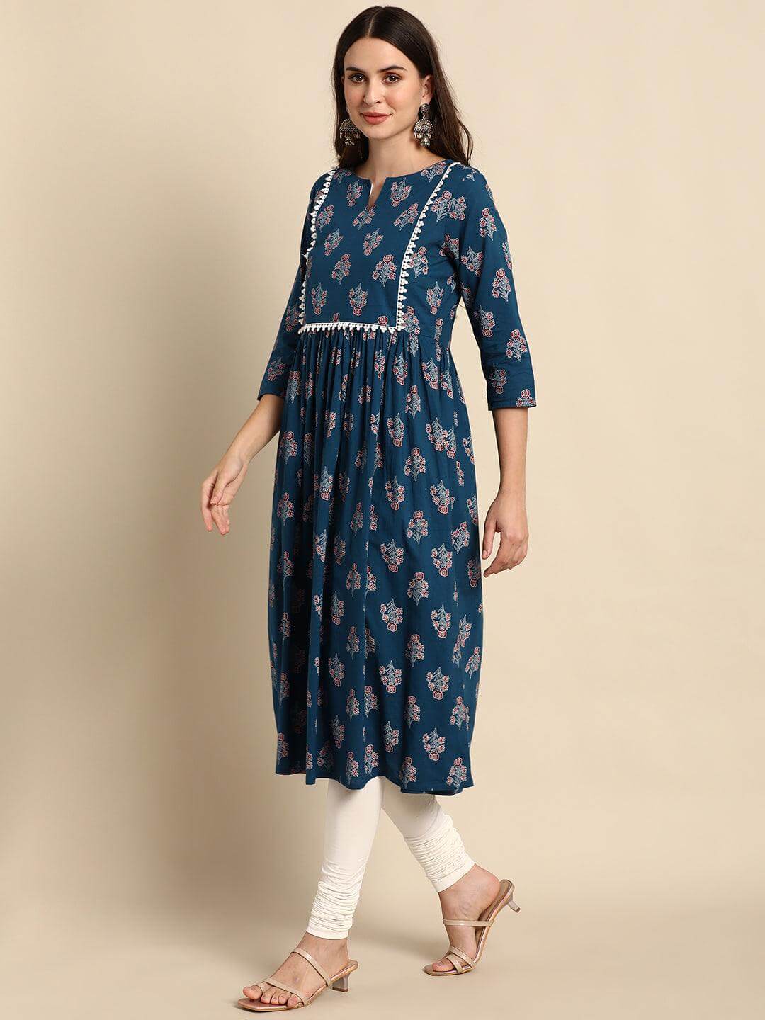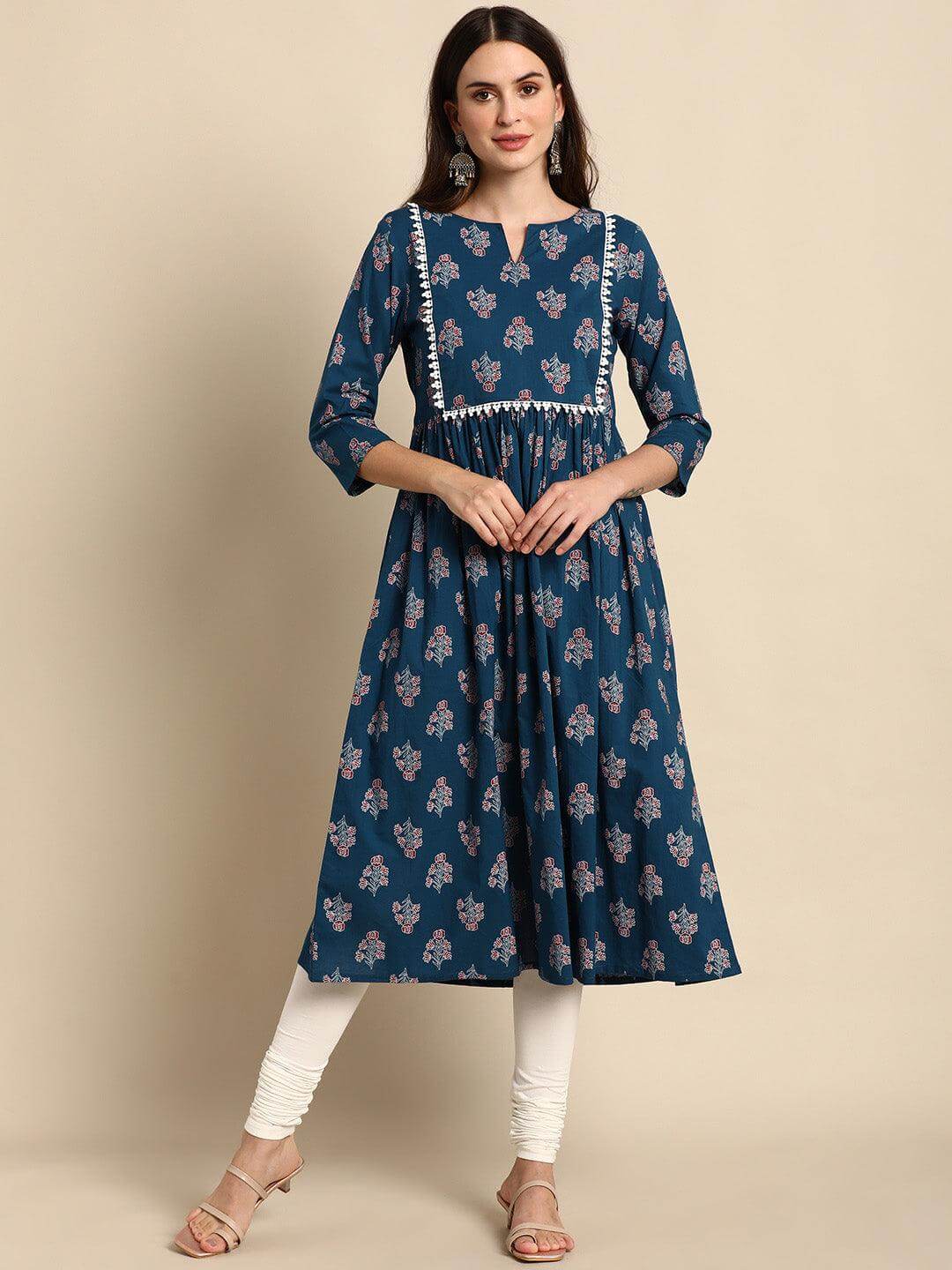 - Style:- Length: 46(inch) | Pattern: Ethnic Motifs | Occasion: Casual | Type: Flared | Sleeve Type: 3/4 Sleeves Regular Sleeves | Color: Teal