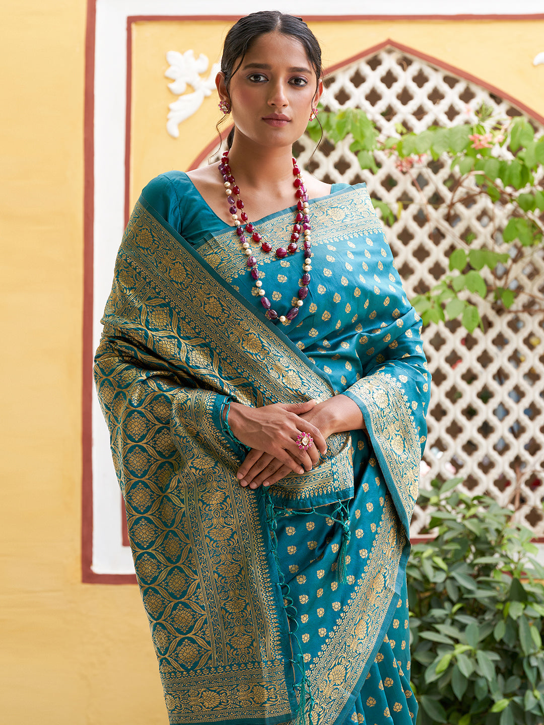 Teal Green Banarasi Silk Woven Ethnic Motifs Saree with Unstitched Blouse Piece