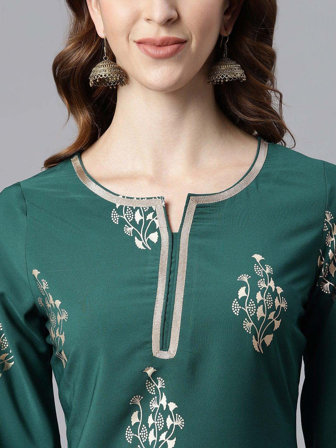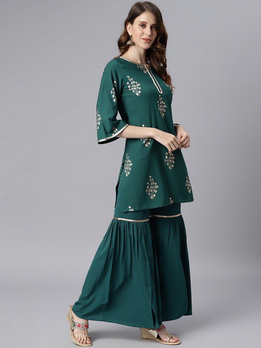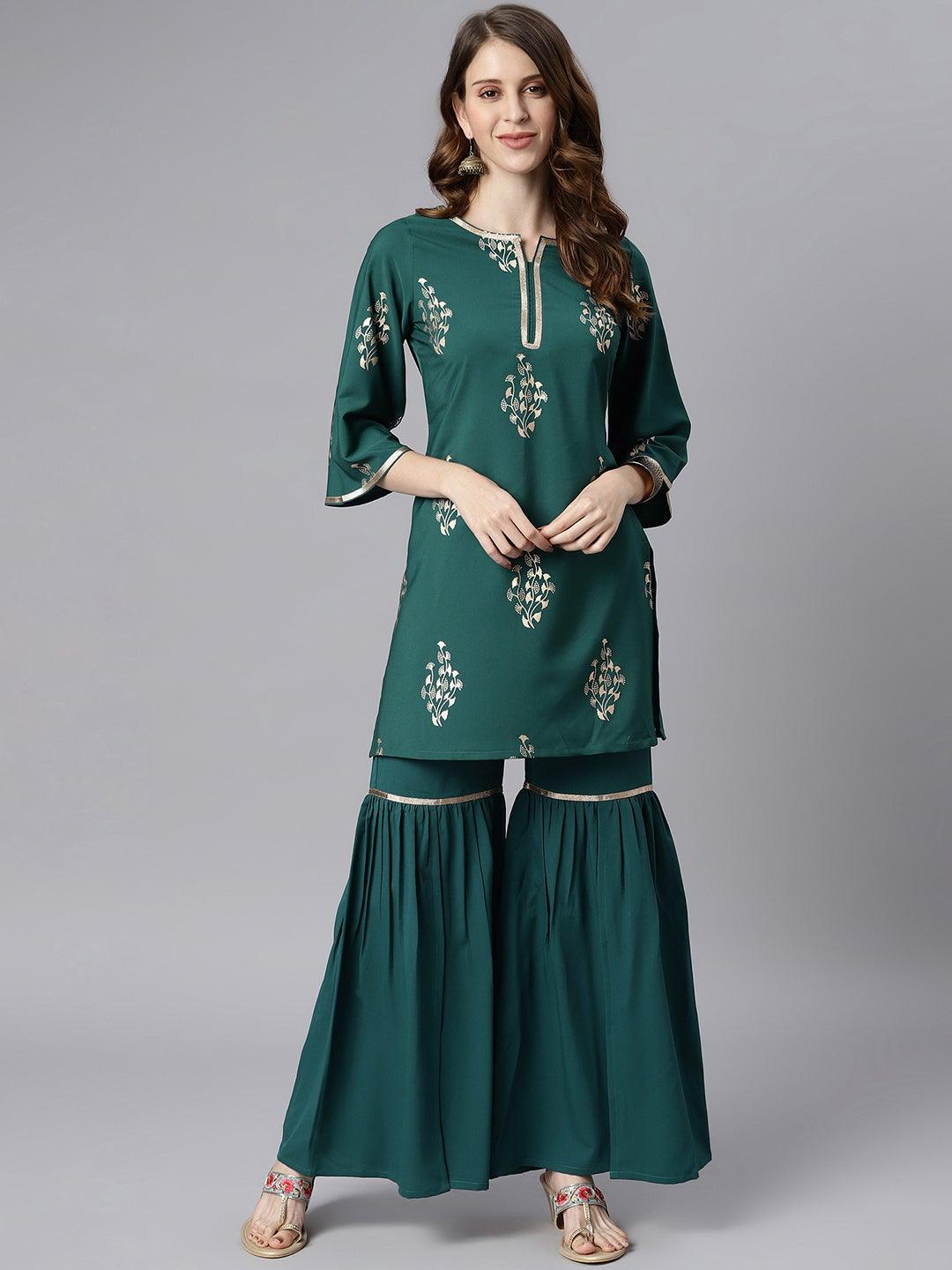 - Get ready to stun the world in this teal green kurta with sharara from Janasya. Crafted out of poly crepe with keeping comfort in mind, the printed straight kurta with lace details gives it extra oomph factor making it look flamboyant yet bold when teamed with sharara. Pair it with some minimalistic jewellery, heels and a classic analogue watch and be prepared to gather the flurry of praises!