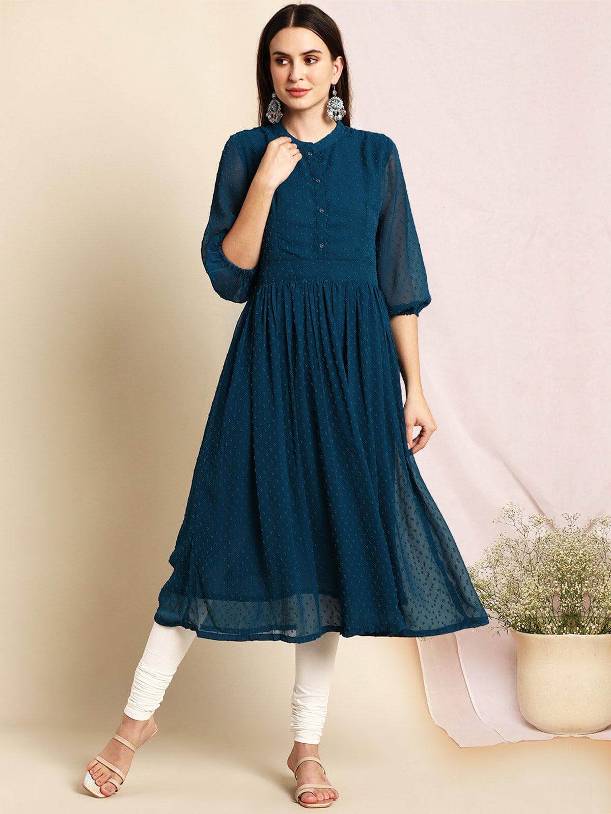 - Style:- Length: 46(inch) | Pattern: Self Design | Occasion: Casual | Type: Flared | Sleeve Type: 3/4 Sleeves Puff Sleeve | Color: Teal