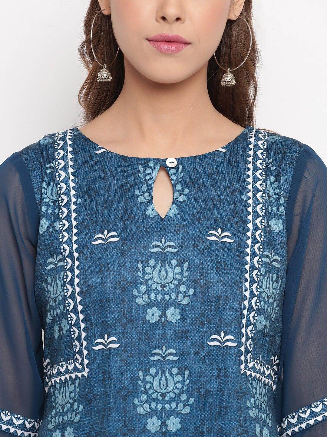 - Go trendy by wearing this teal poly crepe kurta from Janasya. The keyhole neckline and the three-fourth bell sleeve of georgette fabric accentuate its appeal. The digital printed pattern on front panel makes it an irresistible choice. Match it with a pair of pants and platform heels to make every head turn.