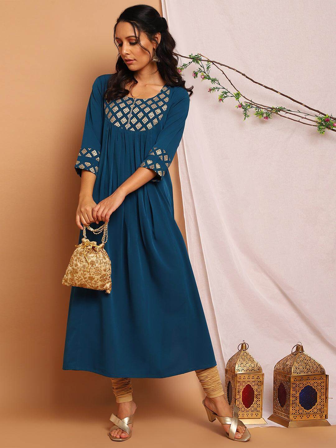 - This sophisticated teal and gold kurta by Janasya is perfect for your ethnic wear needs. Feature a gathered design on waist with print on yoke with printed border on 3/4th sleeves hemline, this straight kurta has a touch of moderness to it.