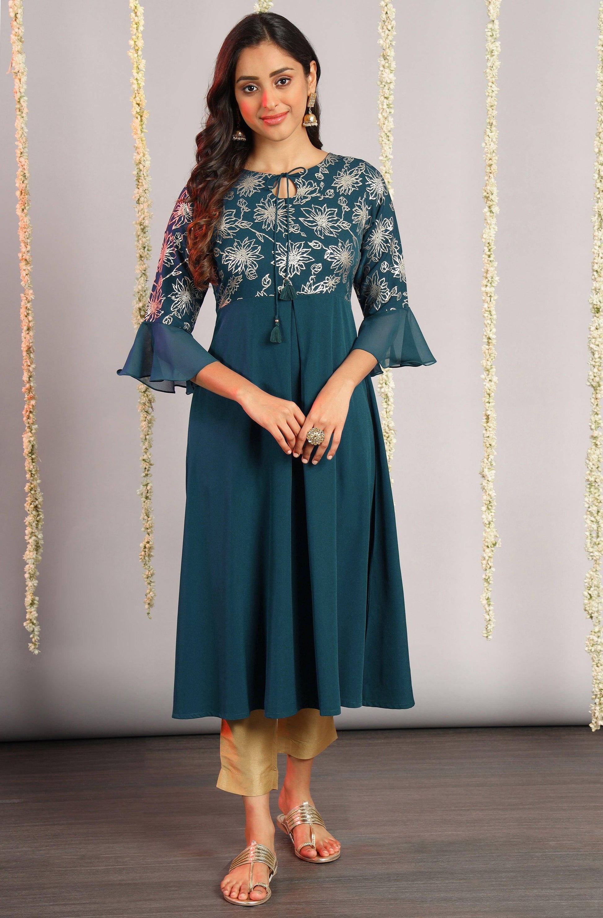 - Exuding feminine vibes, this teal kurta from Janasya will define your traditional outings. Accented with vibrant gold floral motifs on yoke for chic appeal, this poly crepe creation has a keyhole neckline with tie-up accentuated with tassels and beads and 3/4th bell sleeves in georgette fabric. Team this A-line kurta with leggings and jhumkas for complete look.