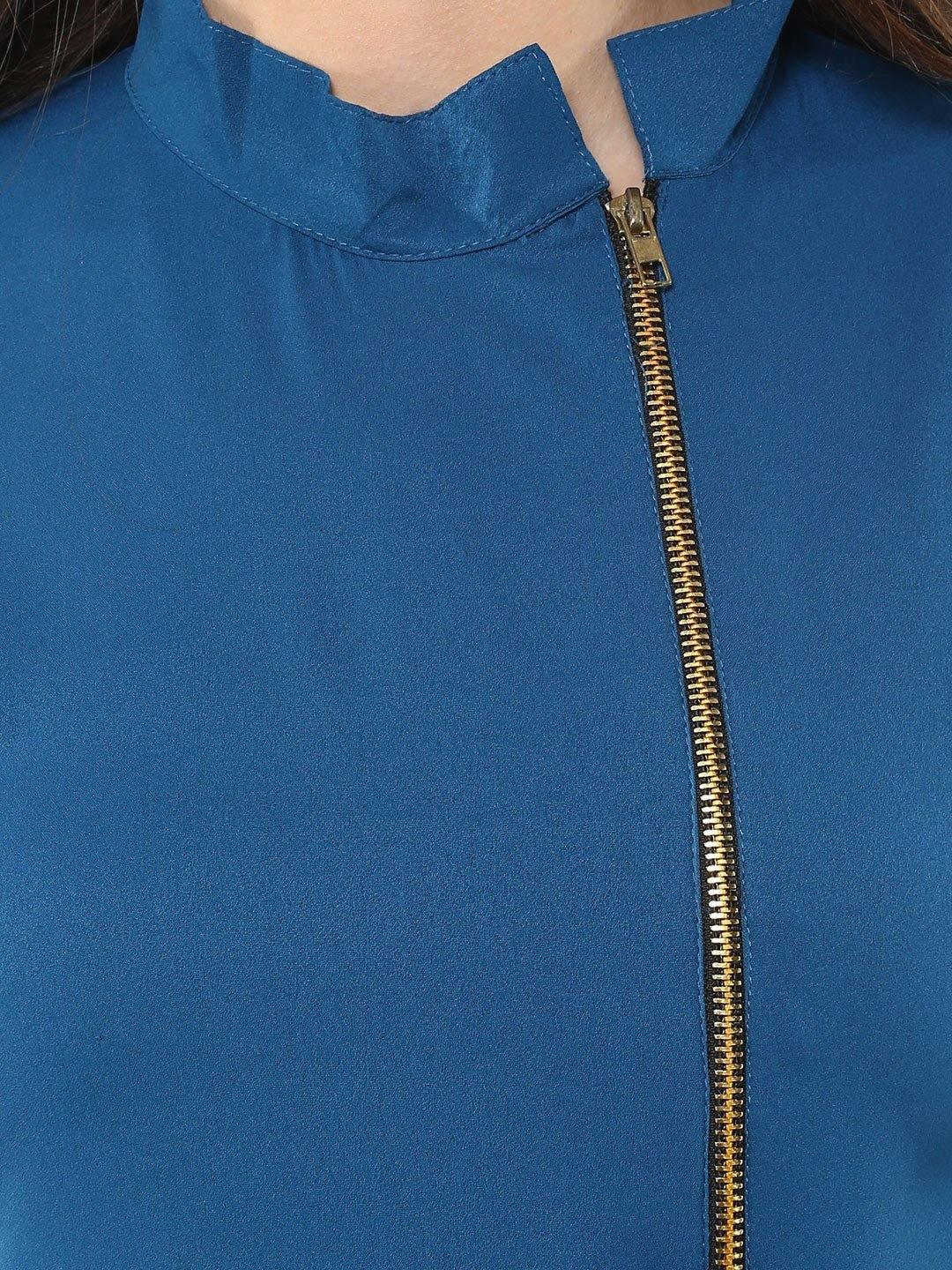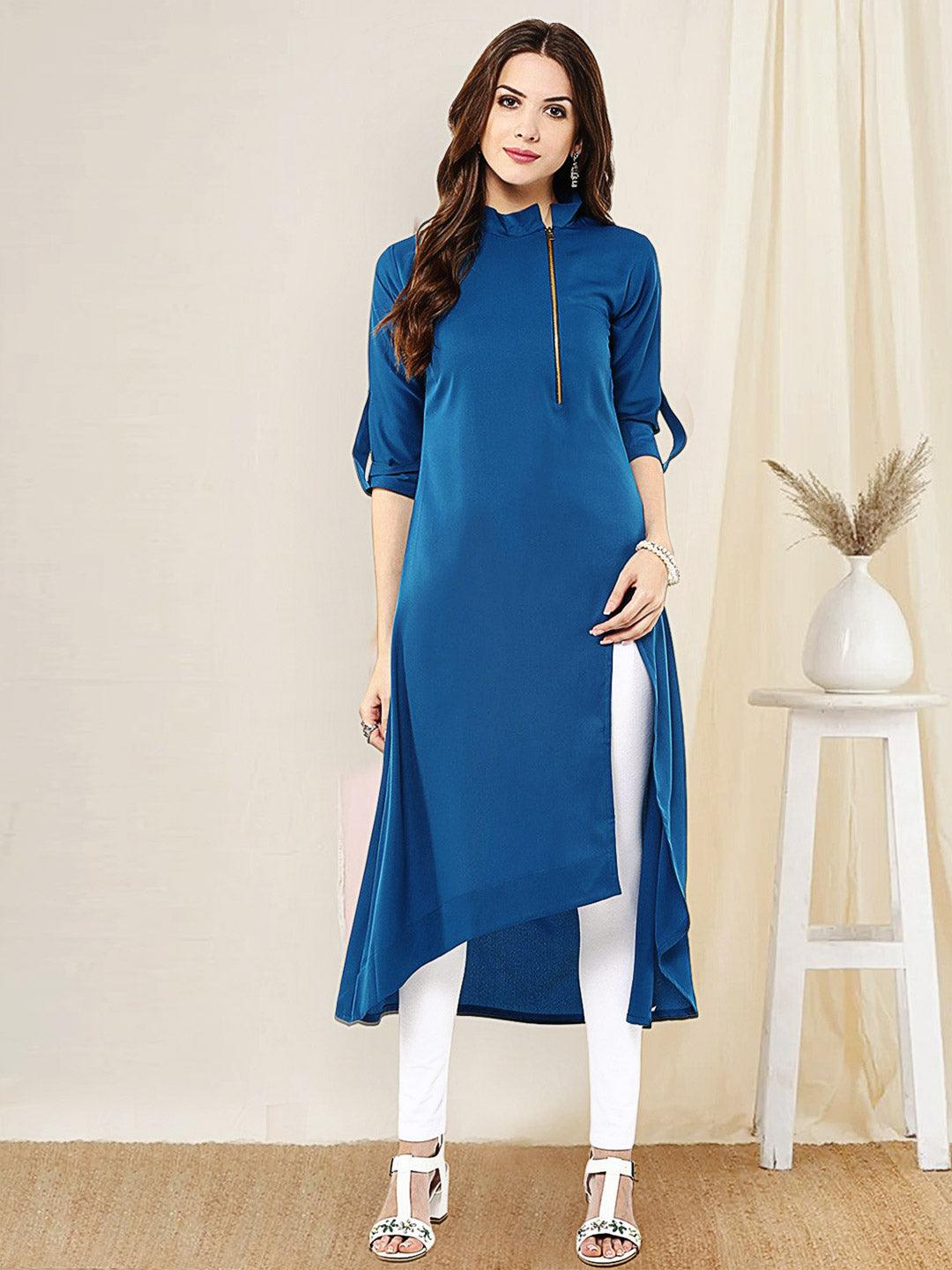 - This stylish solid kurta from janasya is made of poly crepe and comes in an attractive blue color. It features roll-up sleeve,chinese neck,high low and it is calf length kurta that is suitable for casual occasions. Team it with matching leggings for a chic look.
