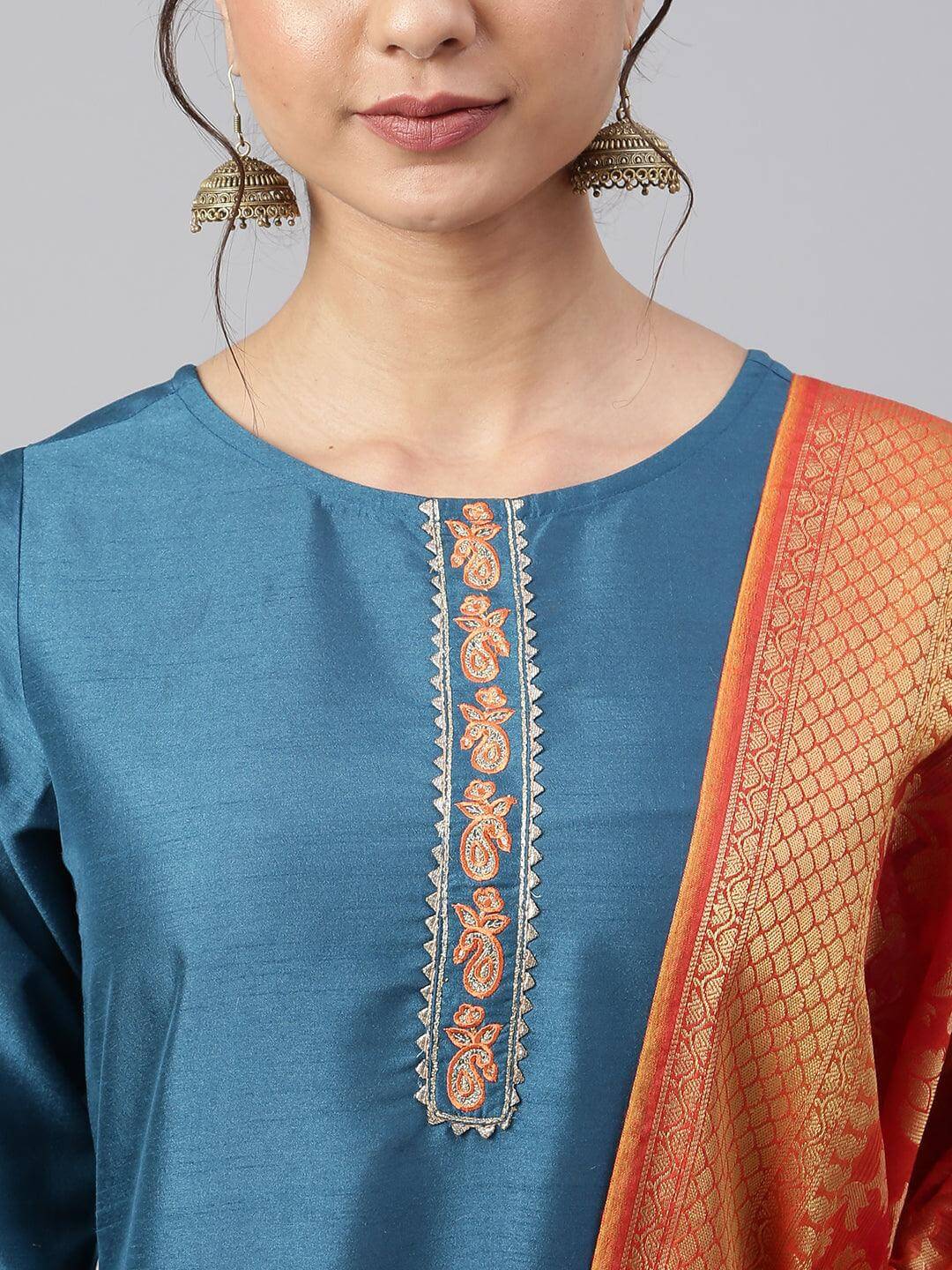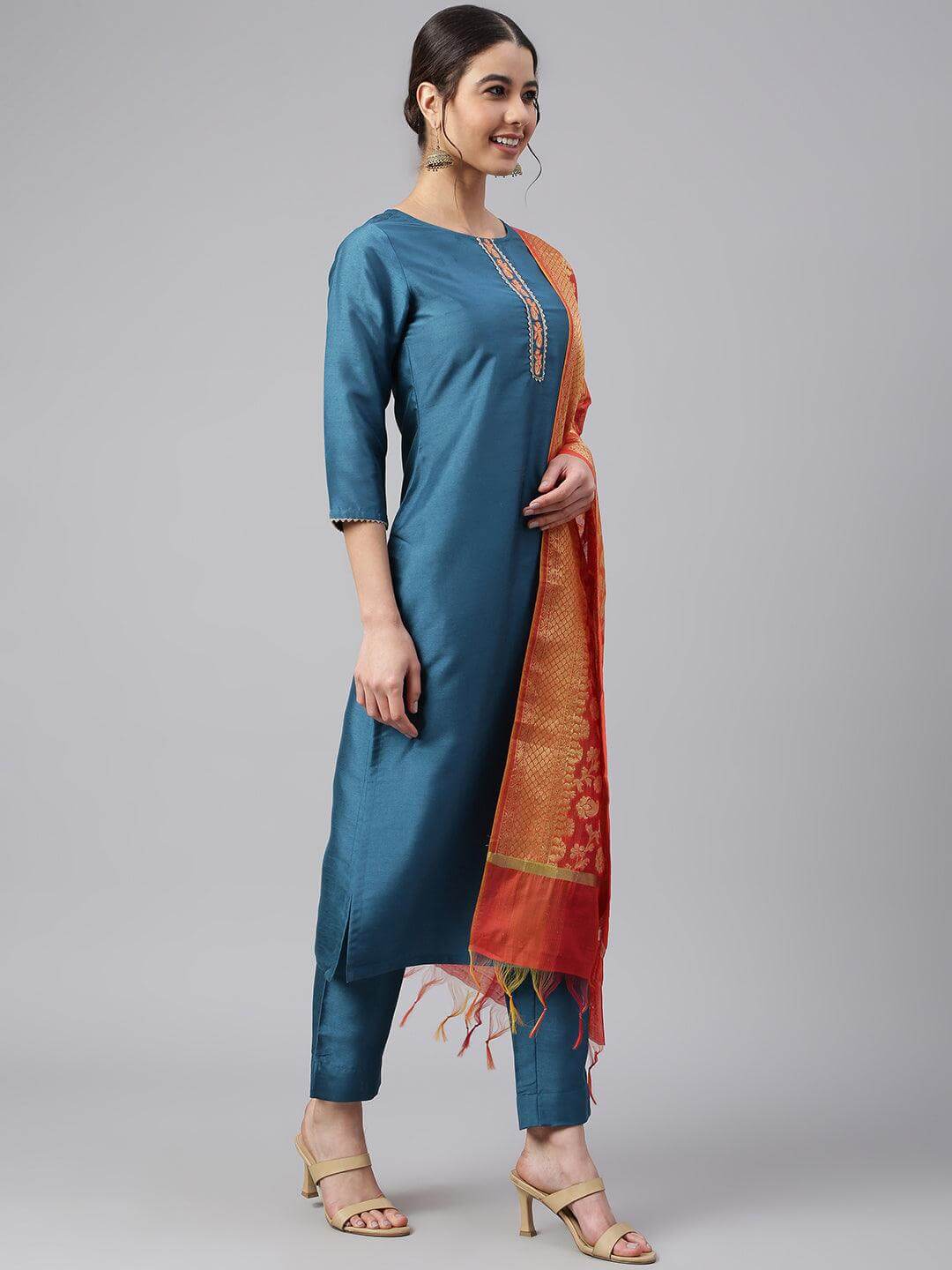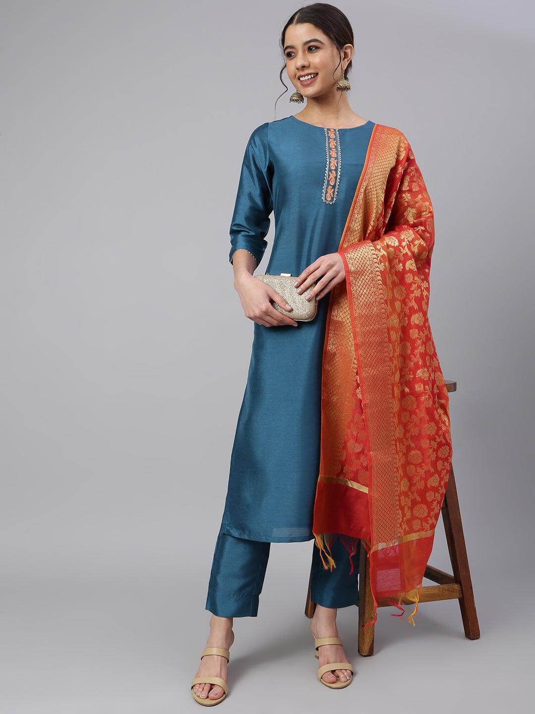 - Kurta Length: 45(inch) | Bottom Length: 36(inch) | Dupatta Color: Orange | Kurta Color: Teal | Pattern: Embellished | Occasion: Casual | Type: Straight | Sleeve Type: 3/4 Sleeves Regular Sleeves