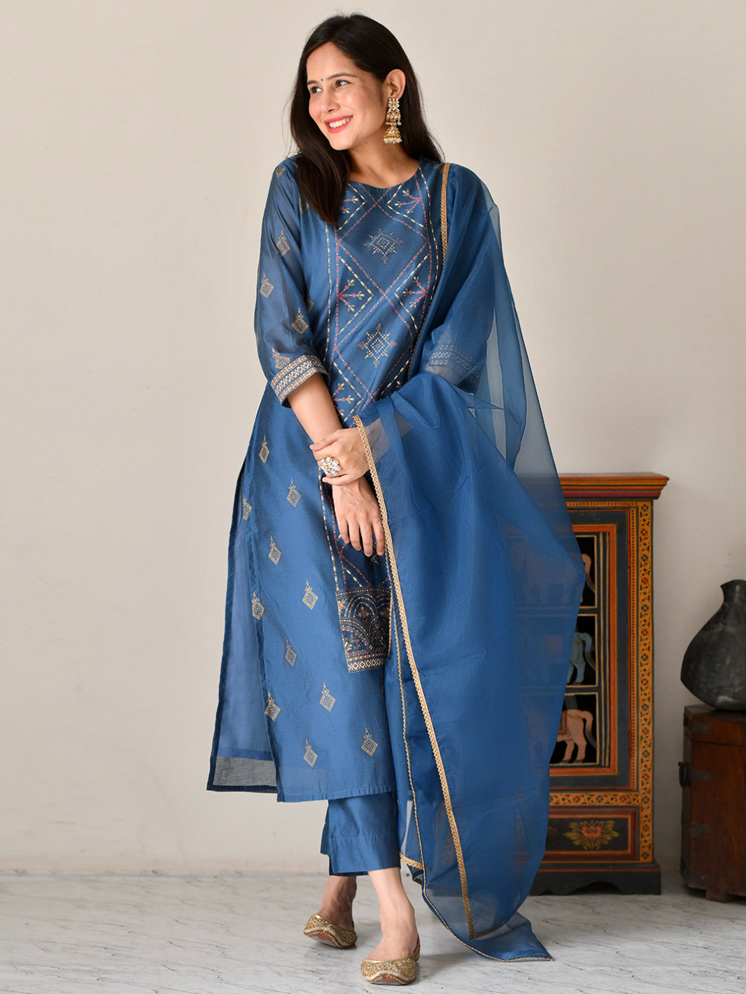 Teal Poly Silk Kurta With Pant and Dupatta