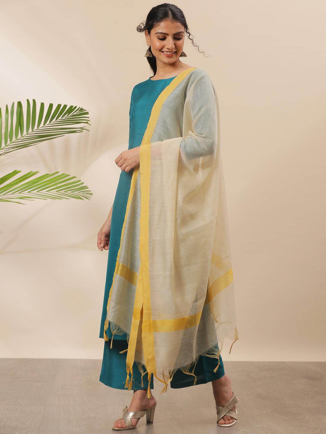 Teal Poly Silk Solid Kurta with Palazzo and Dupatta