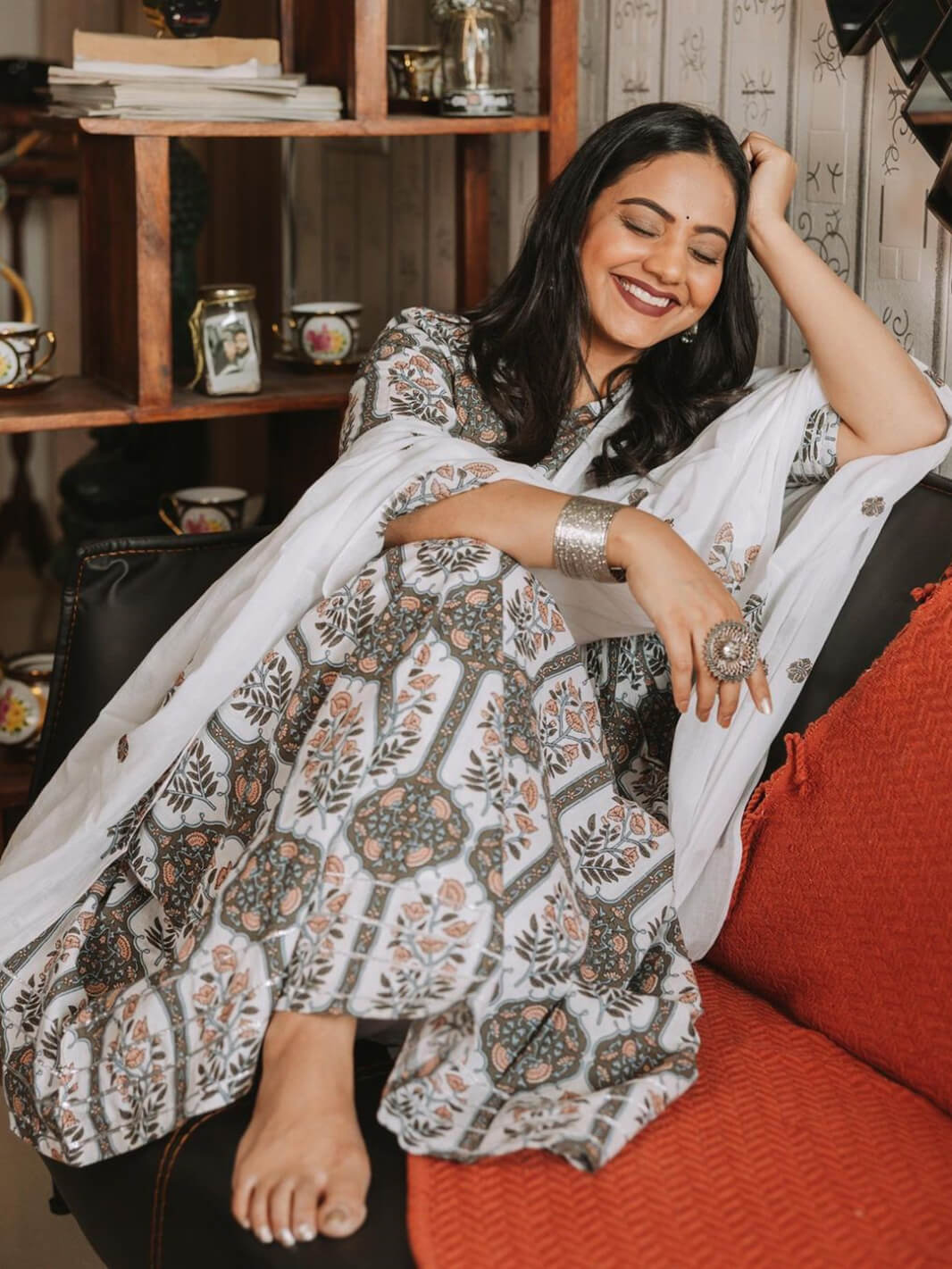 - Kurta Length: 46(inch) | Bottom Length: 38(inch) | Dupatta Color: White | Kurta Color: White | Pattern: Botanical Printed | Occasion: Casual | Type: Flared | Sleeve Type: Half Sleeve Regular Sleeves