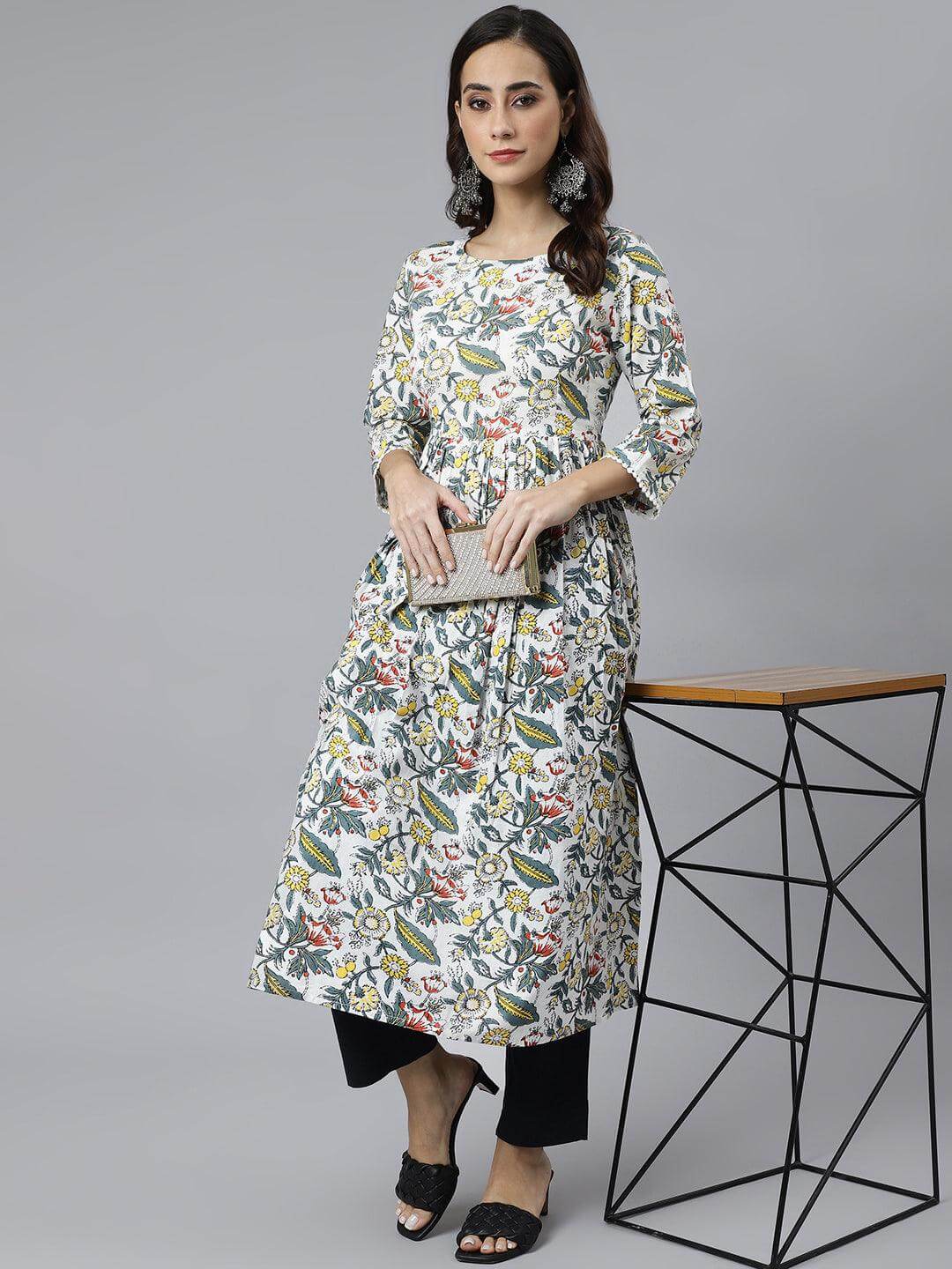 - Dress up on your weekends in this adorable white cotton floral printed flared kurta designed with a comfortable silhouette , quarter sleeves with gota detailing and you can easily pair it with straight pants to get a chic look.