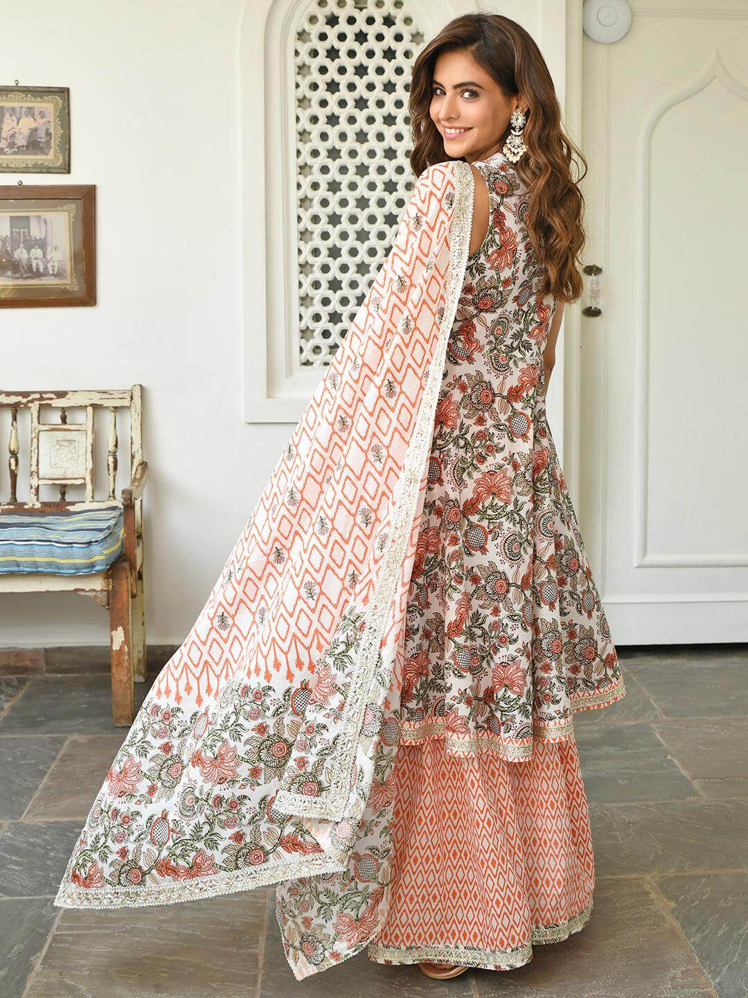 - Dress this season with a white and orange floral hand block printed sharara set. The set is crafted in cotton fabric and it features lace work detailing at the hemline, round neckline, with flared silhouette. The sharara has orange chevron prints all over to enhance the look and the dupatta is also designed with lace detailing at the borders.