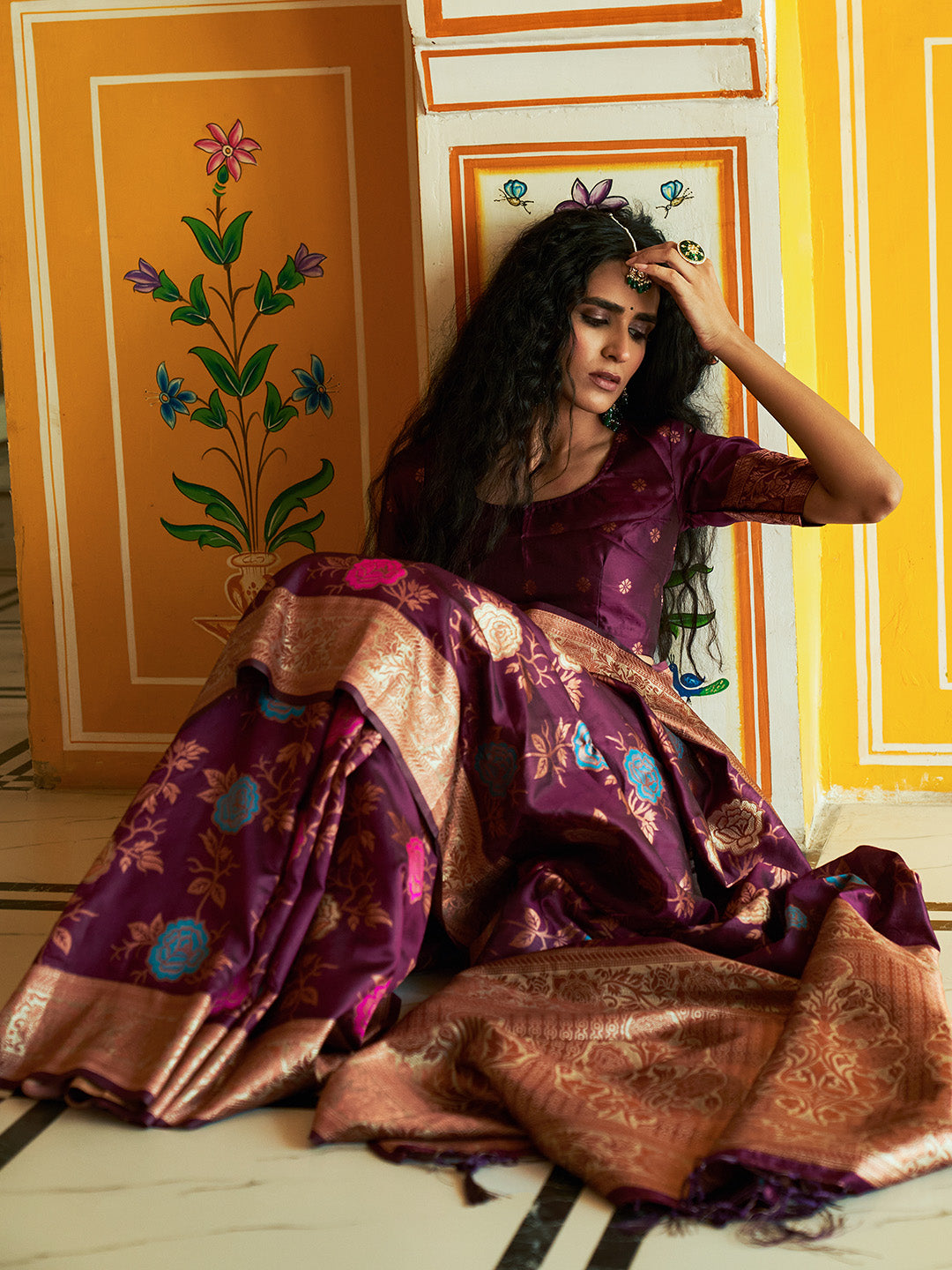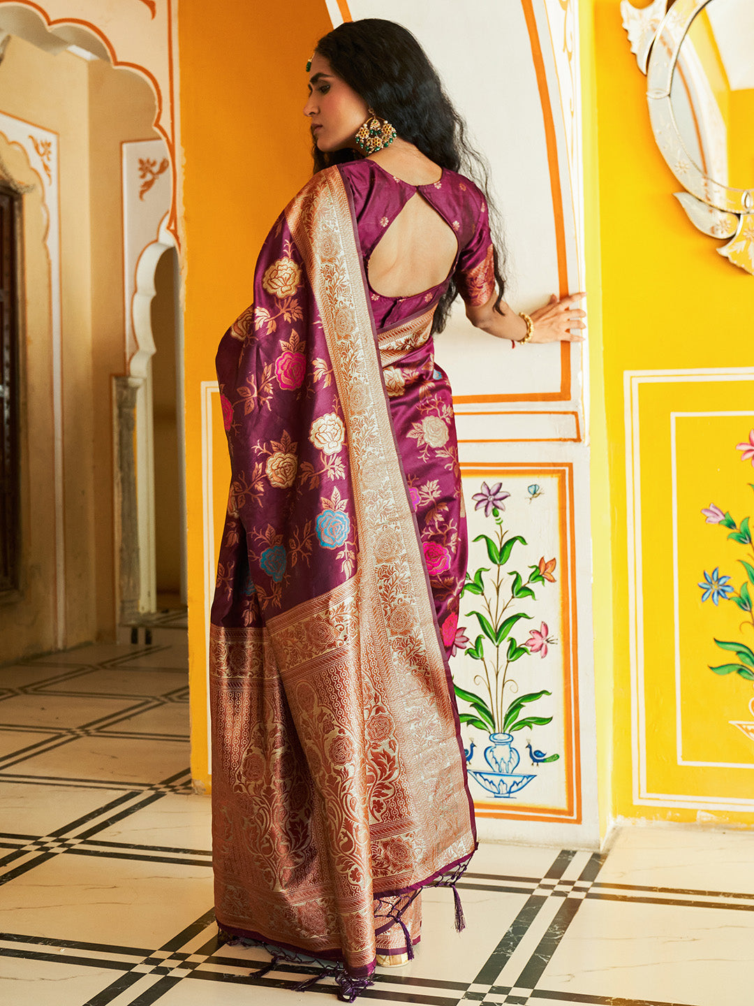 Wine Banarasi Silk Ethnic Motifs Saree with Unstitched Blouse Piece