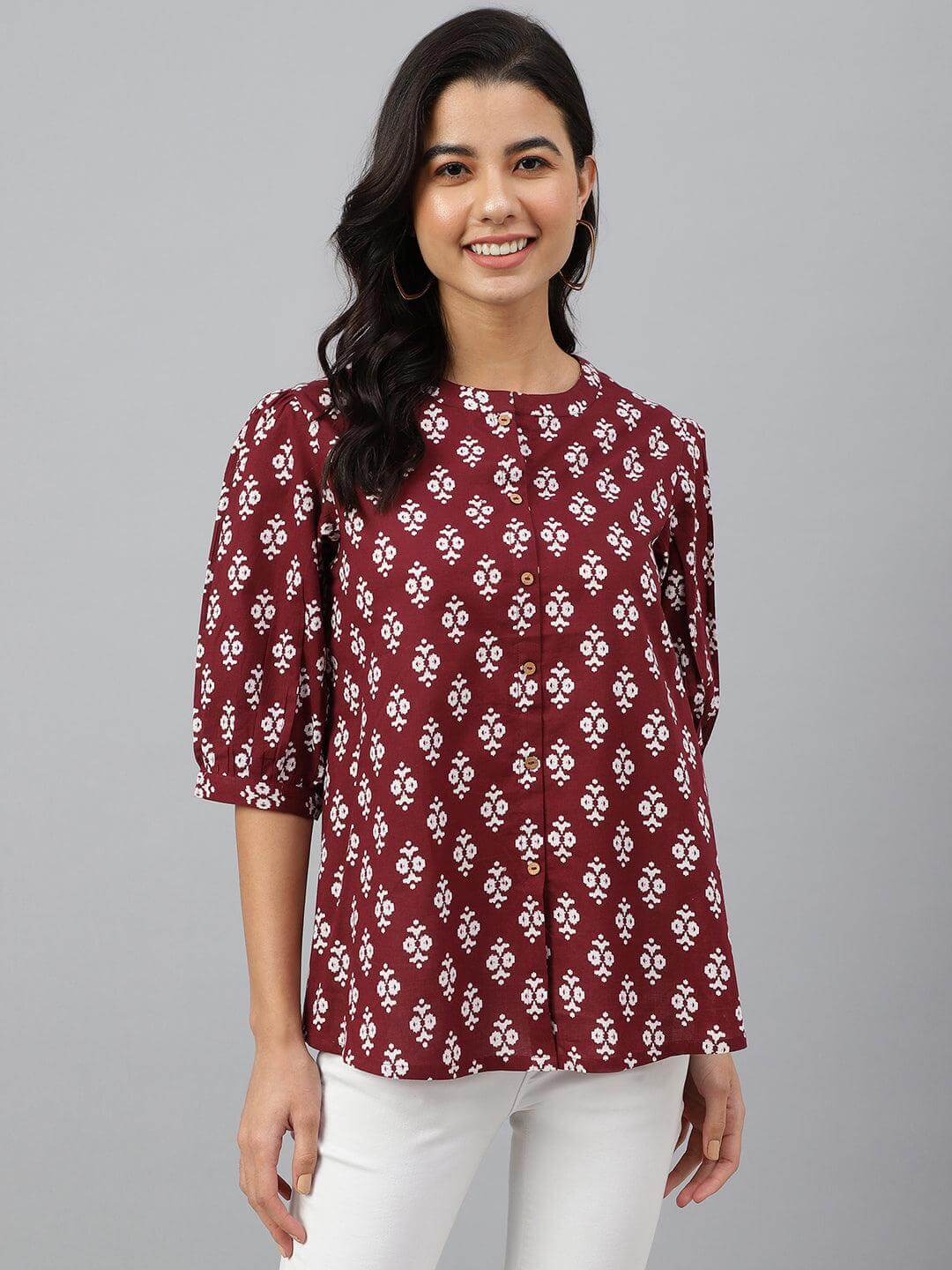 - Dress in style with this wine printed cotton top that comes with mandarin collar, 3/4 sleeve puff sleeve, button placket on A-line silhouette.