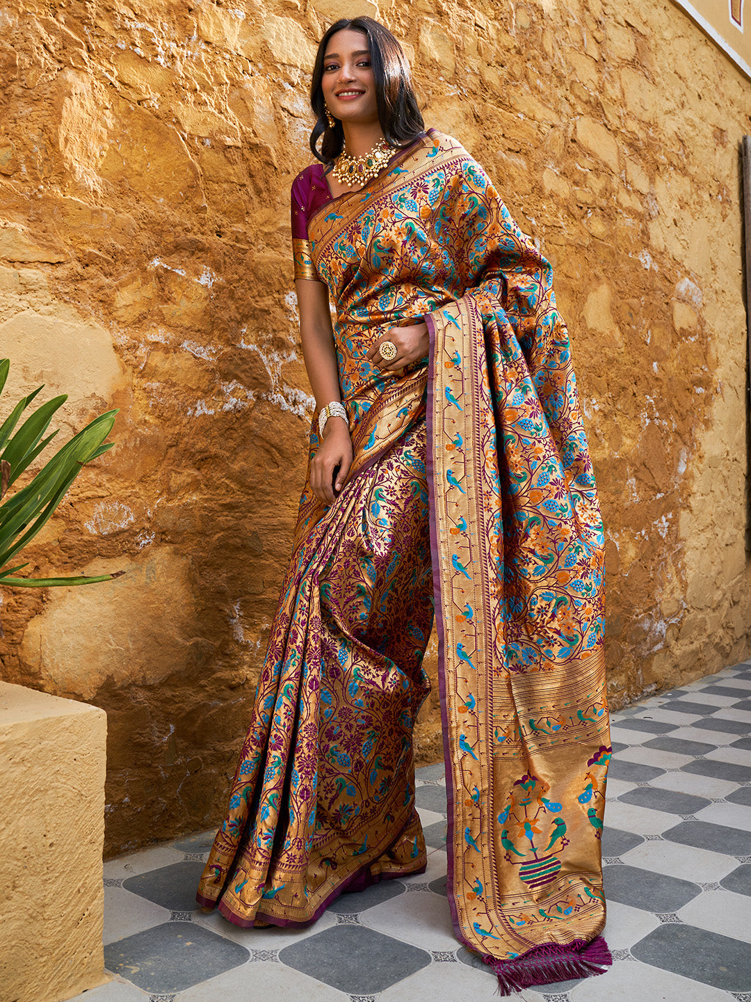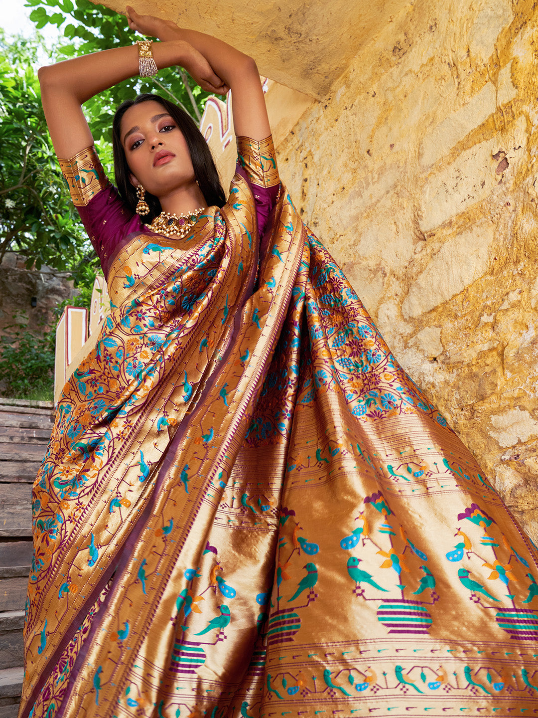 Wine Paithani Silk Woven Bagh Design Saree with Unstitched Blouse Piece