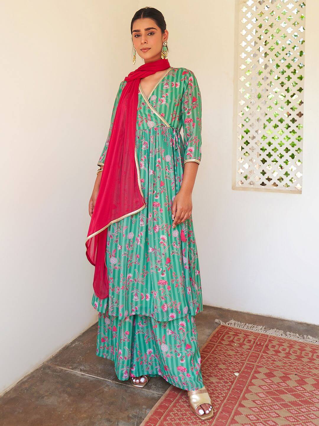 - Elevate your ensemble with this amazing green digital floral printed kurta palazzo set with pink dupatta by Janasya. Crafted in georgette, it features a v-neck with angarakha style and gota work detailing, 3/4th regular sleeves, with fit and flare silhouette with tie-ups and tassel. The kurta is paired with printed green palazzo with fully elasticated waistband and a solid pink chiffon dupatta with gota lace detailing at the borders. Complete the elegant look with statement jewellery.