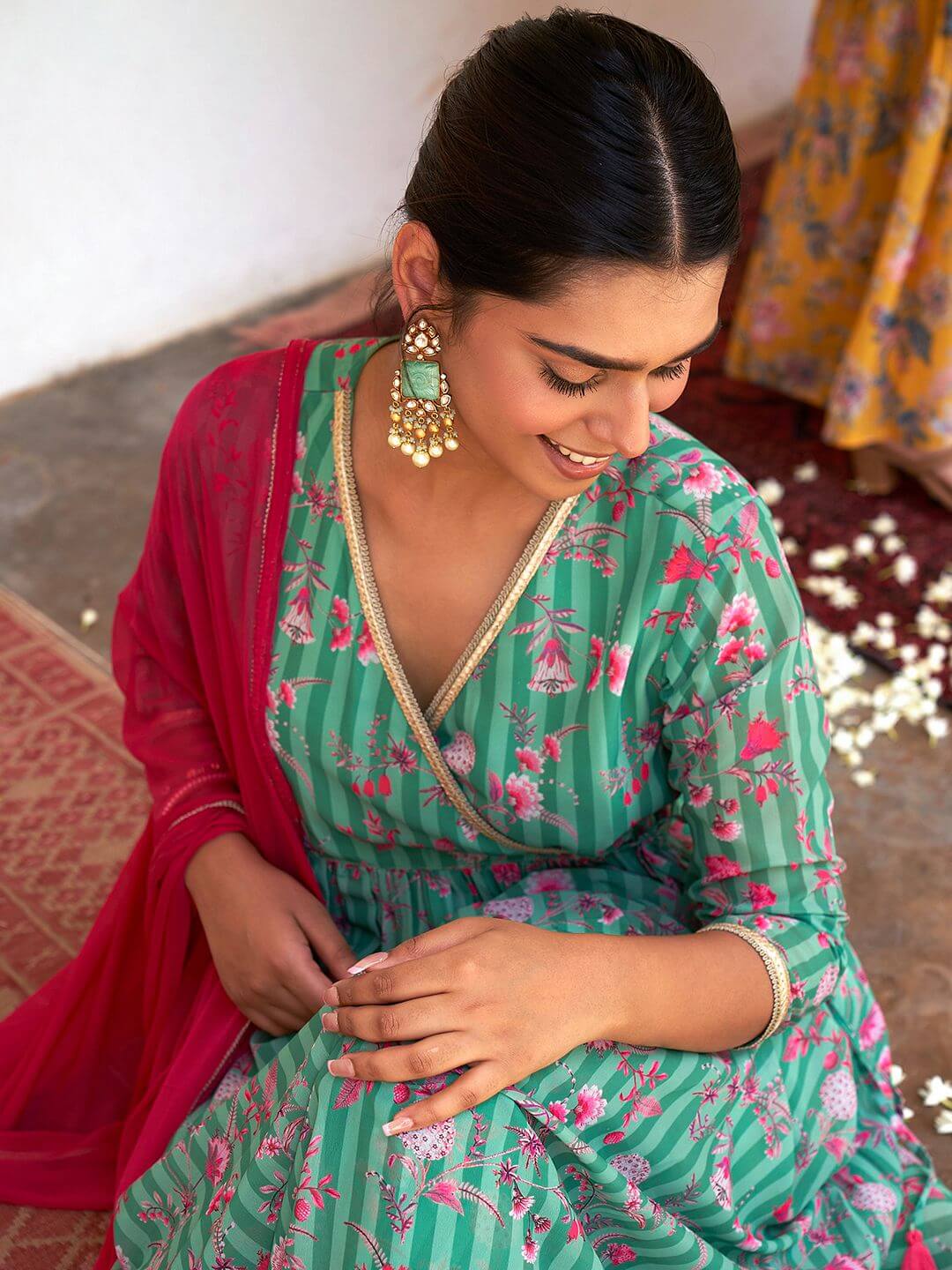 - Kurta Length: 45(inch) | Bottom Length: 40(inch) | Kurta Color: Green | Pattern: Digital Floral Printed | Occasion: Festive | Type: Angarakha | Sleeve Type: 3/4th Sleeves Regular Sleeves