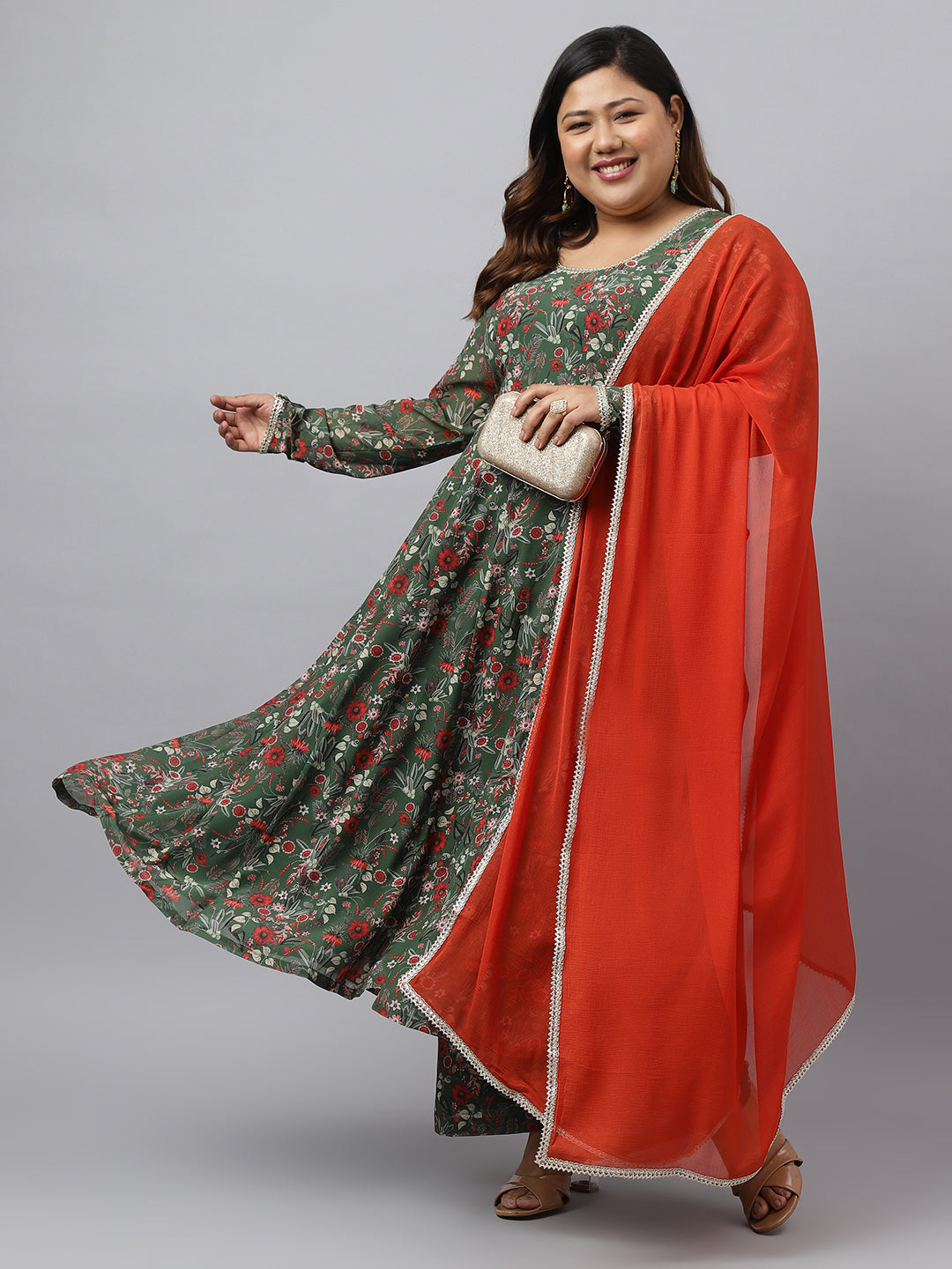 - Style:-Kurta Length: 48(inch), Bottom Length: 38(inch) | Pattern: Digital Floral Printed | Occasion: Festive | Type: Anarkali | Sleeve Type: Full Sleeve | Neck Type: Round Neck | Color: Bottle Green