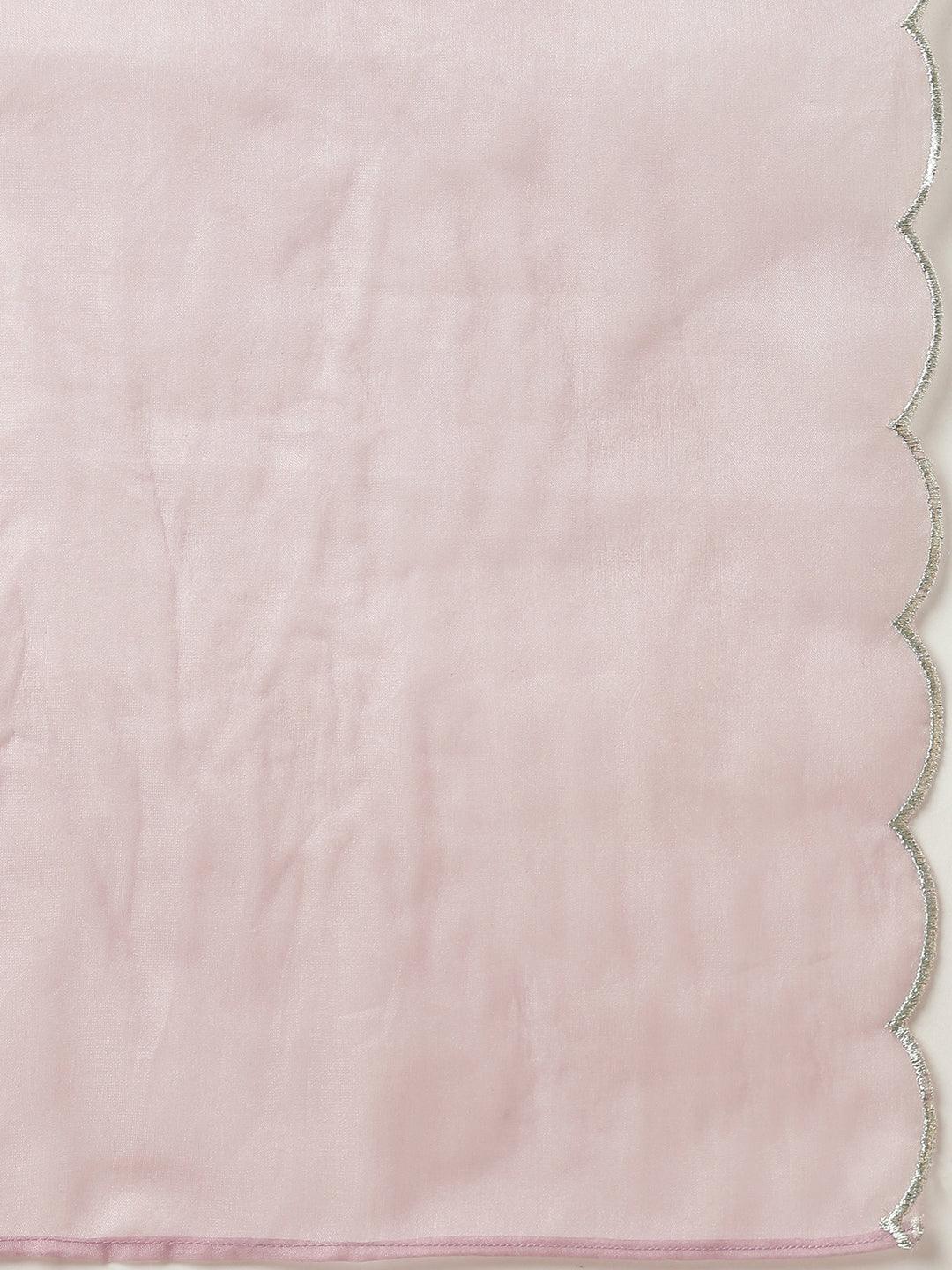 - Revamp your wardrobe with this lavender embellished chinon kurta pant set with organza dupatta featuring v-neck with lace work and delicate embroidery on front panel, 3/4sleeves with straight fit. The kurta is paired with narrow pant in same fabric and light weight organza dupatta with scalloped border.