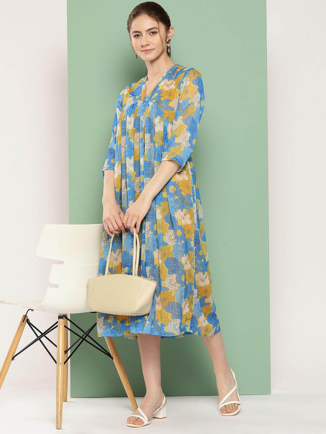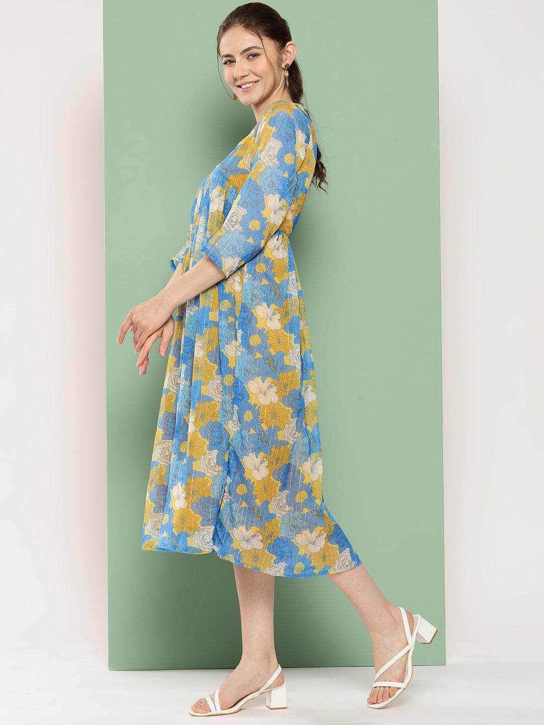 - Style:- Length: 45(inch) | Pattern: Floral Printed | Occasion: Casual | Type: flared | Sleeve Type: 3/4 Sleeves Regular Sleeves | Color: Yellow