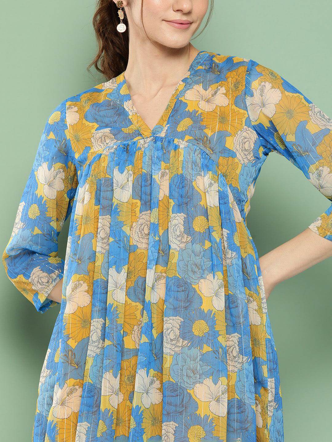 - Bring your style game to elegance with this yellow chiffon lurex floral printed flared kurta by Janasya crafted in chiffon lurex fabric featuring all over floral prints, v neck with gathers at the front, 3/4th sleeves with fit and flared silhouettes. Pair it up with solid pants to complete the look. The kurta includes butter crepe lining.
