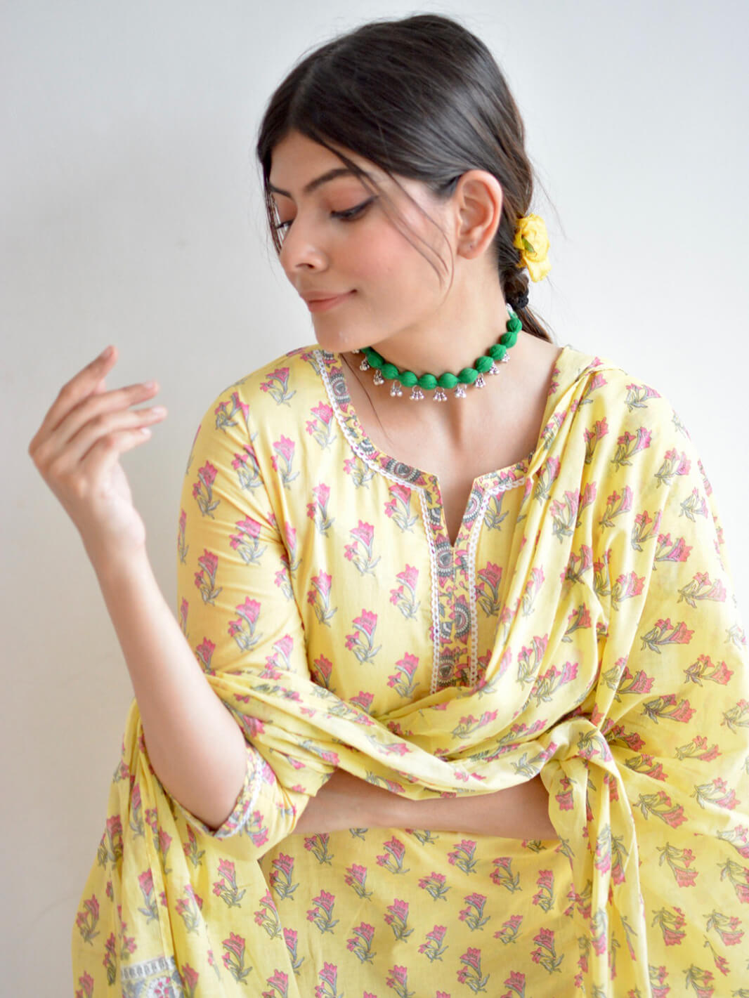 Yellow Cotton Floral Print Kurta with Pant and Dupatta