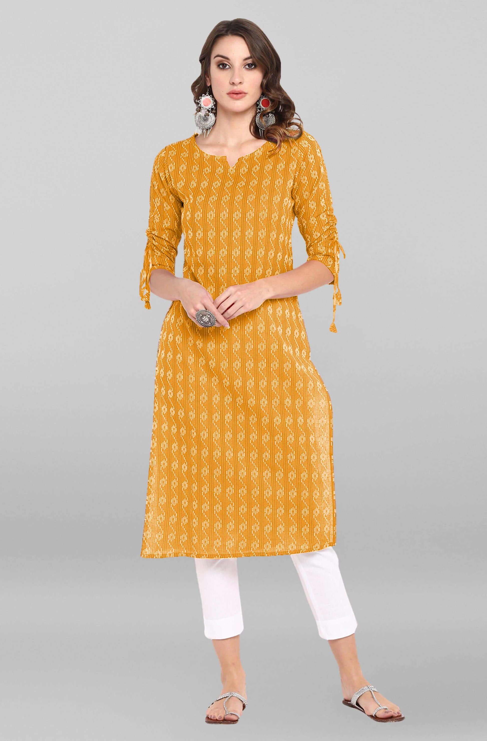 - Style:- Length: 44(inch) | Pattern: Woven Design | Occasion: Casual | Type: Straight | Sleeve Type: 3/4 Sleeves Regular Sleeves | Color: Yellow