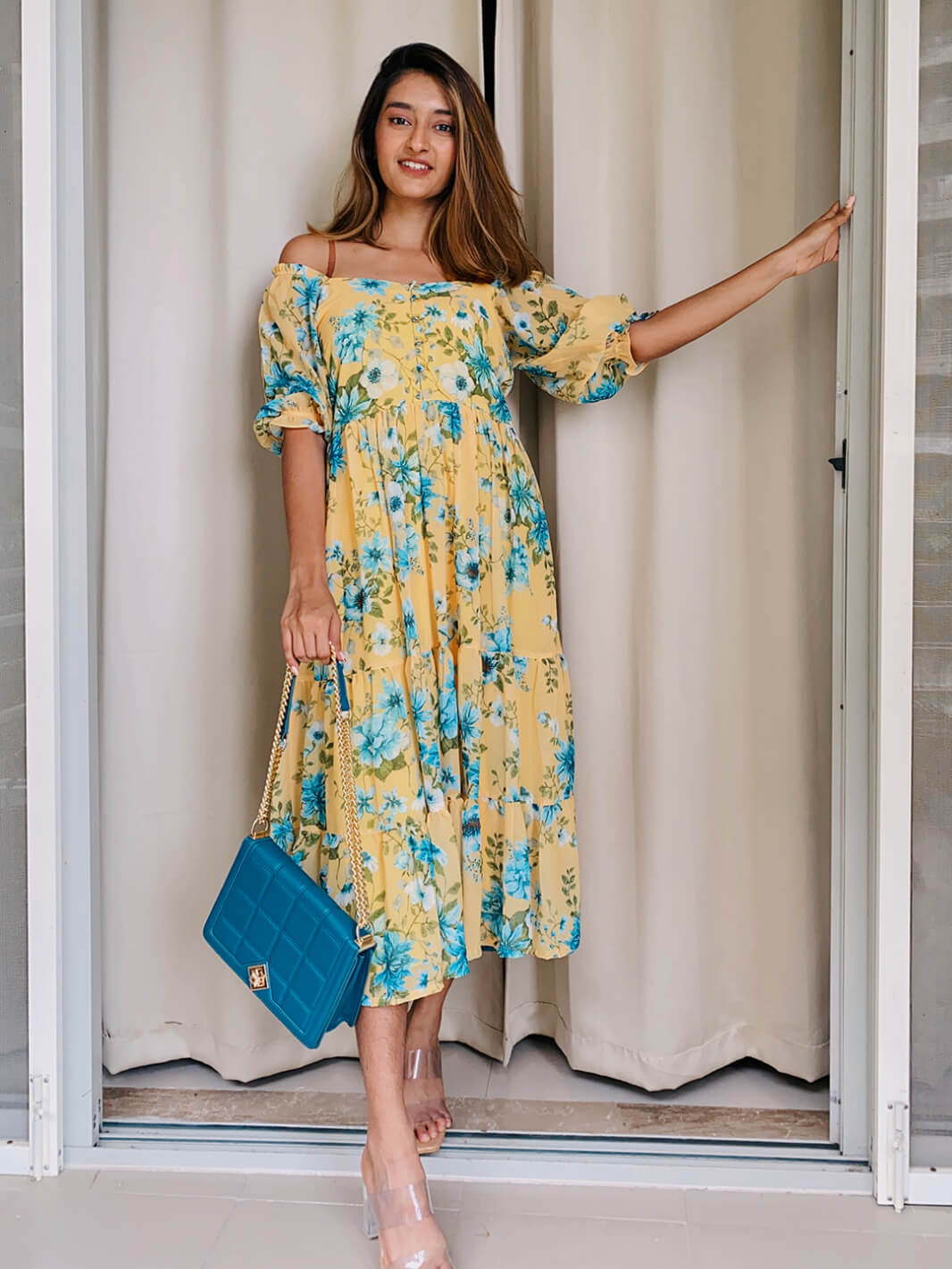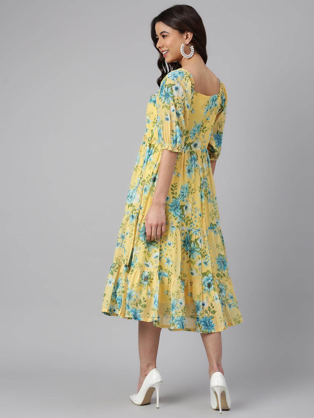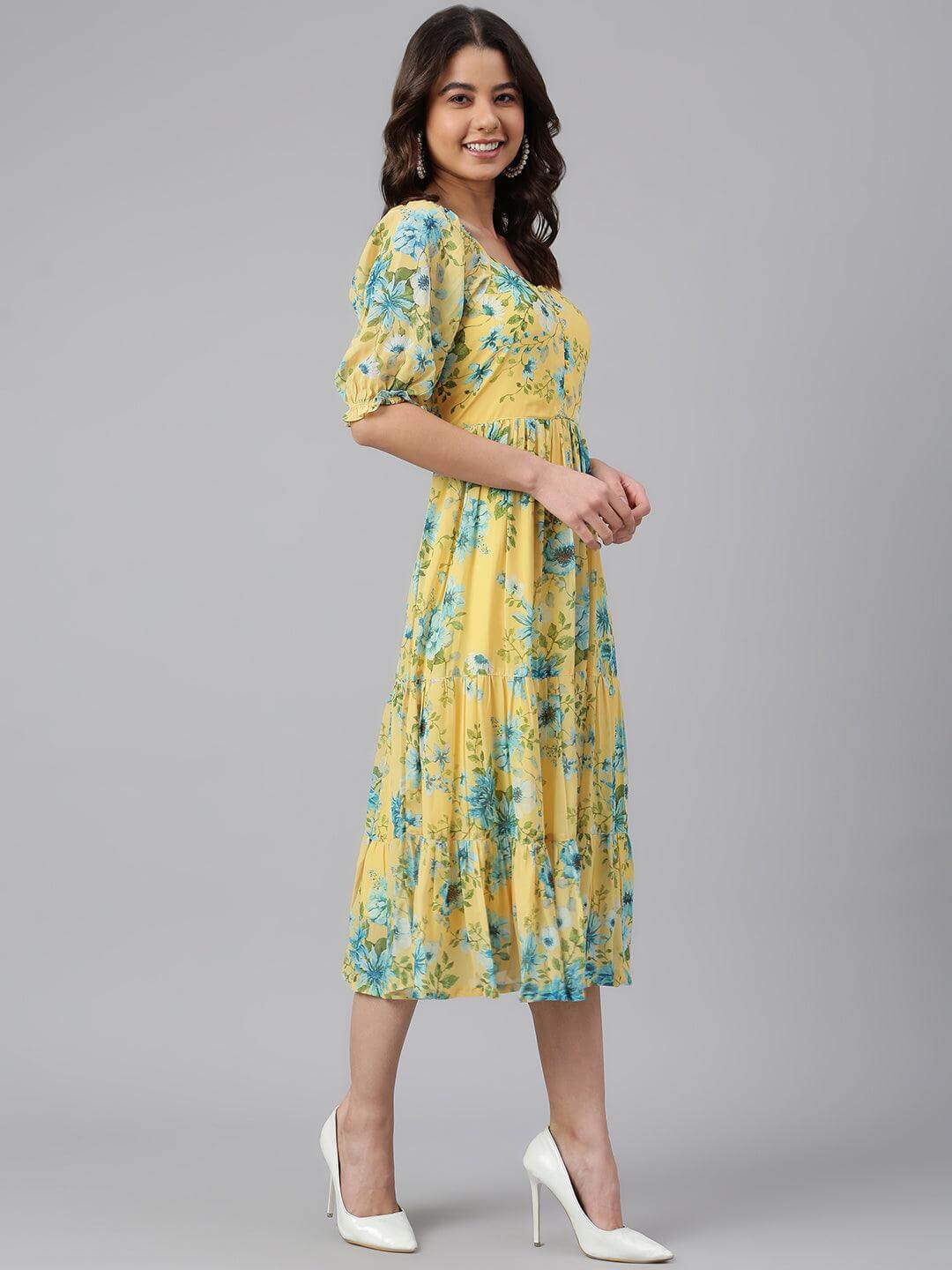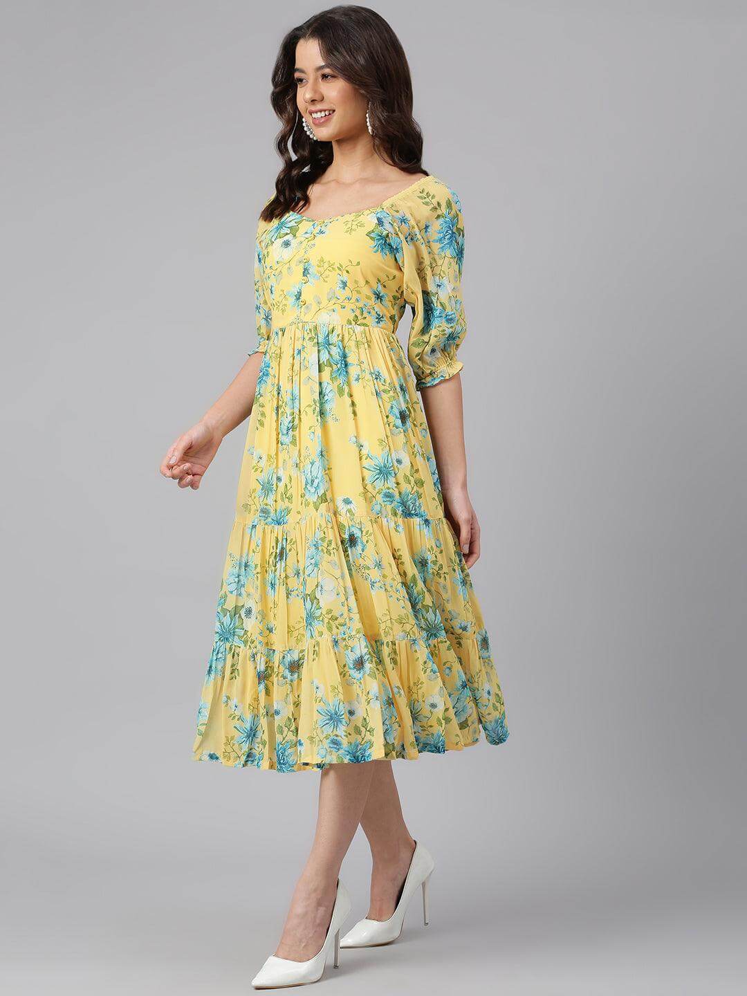 - Style:- Length: 43(inch) | Pattern: Floral Print | Occasion: Casual | Type: Flared | Sleeve Type: 3/4 Sleeve( Puff Sleeve) | Color: Yellow