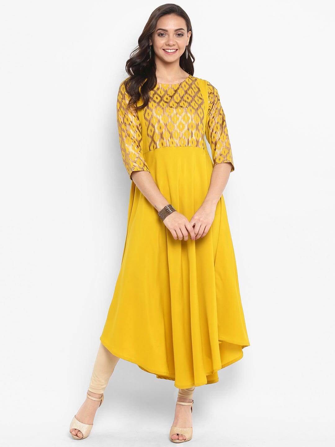 - This stylish gold print kurta from janasya is made of poly crepe and comes in an attractive yellow color. It features 3/4 Sleeve,round neck,flared and it is calf length kurta that is suitable for casual occasions. Team it with matching leggings for a chic look.